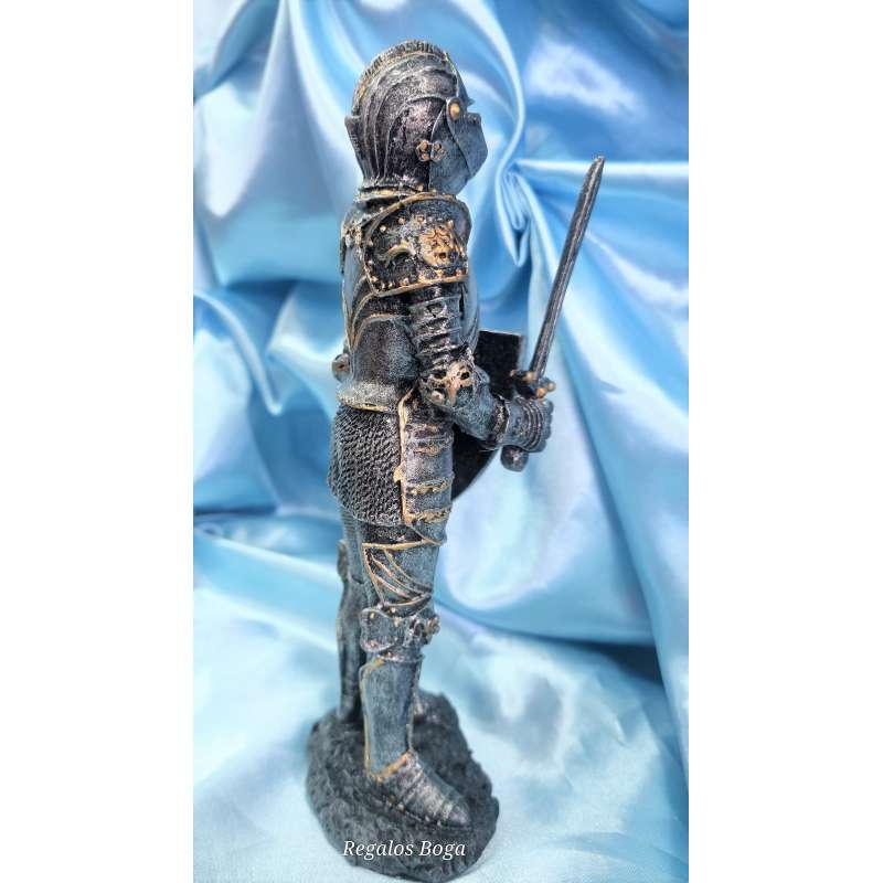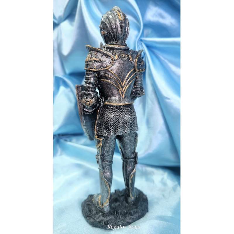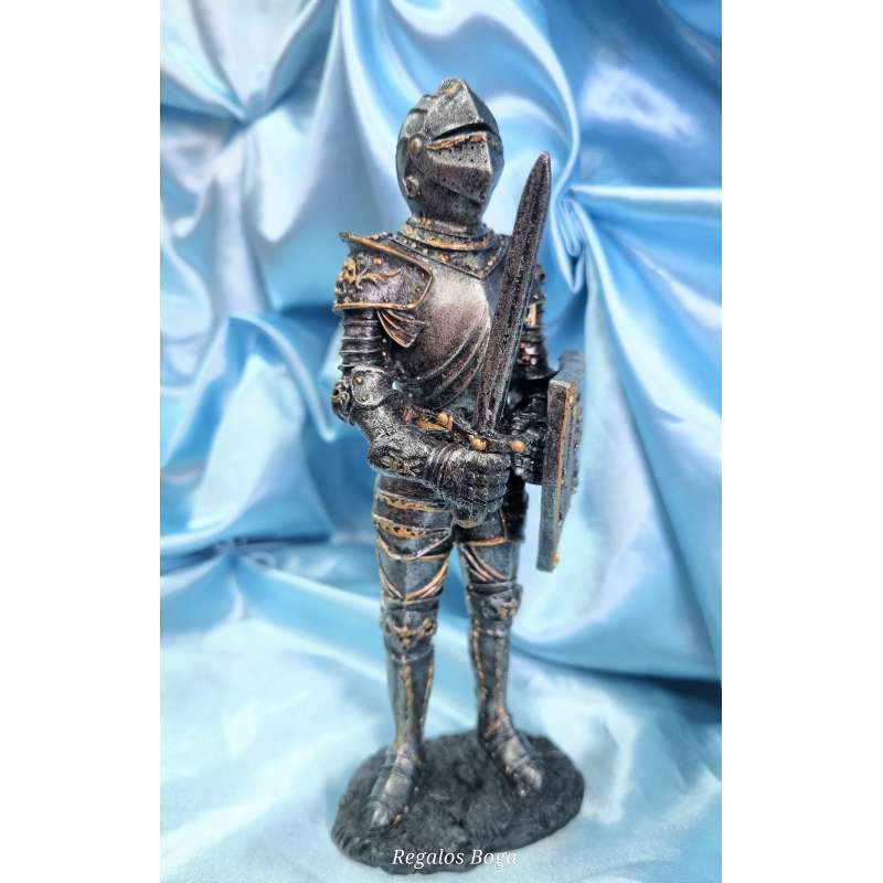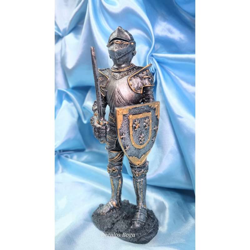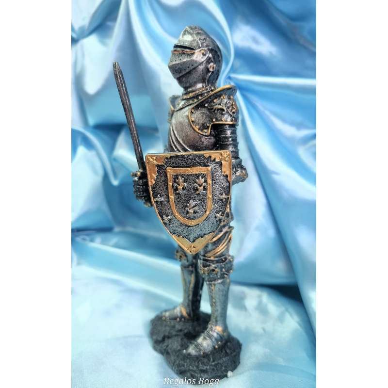 Figura de caballero medieval con armadura completa y escudo con el símbolo de flor de lis, es uno de los mas importantes en la heráldica junto a la cruz, el león y el águila. En su mano sujeta una firme espada.