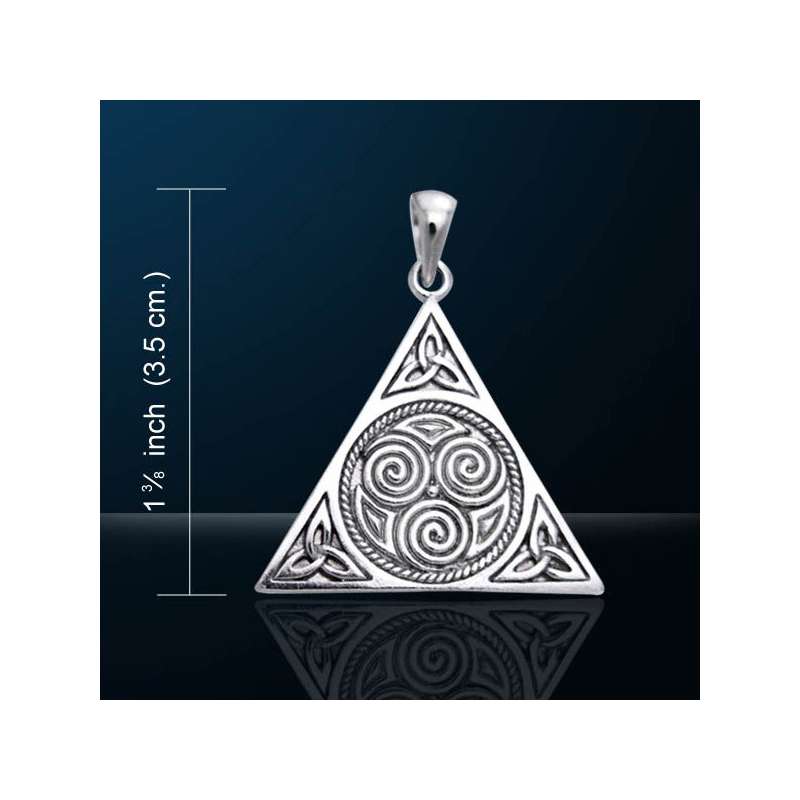 Es un colgante representante del numero tres, tres lados del triangulo, tres angulos, tres espirales, tres trisqueles celtas.