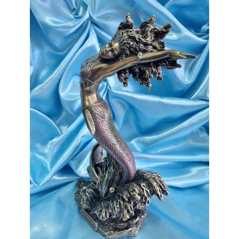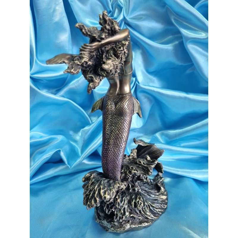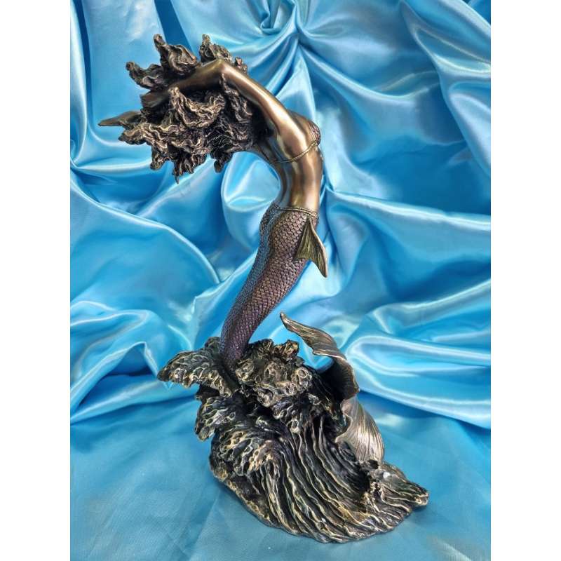 Realizada en una mezcla de resina y de metal esta mezcla le da un acabado clásico antiguo, la fuerza de la tremenda cola la empuja fuera del mar, las olas rompiendo y la brisa del mar fluye a través de sus largos rizos, es una de las sirenas míticas del mar.