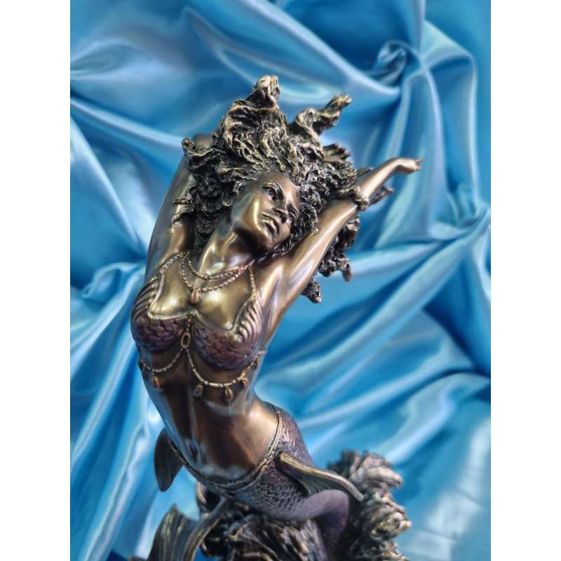 Su cola y bikini tienen una tonalidad púrpura esto le suma un acento sutil para el acabado de bronce antiguo de esta poderosa escultura de sirena. Esta escultura es una adquisición hermosa y puede formar parte de tu altar a la diosa.