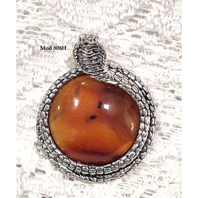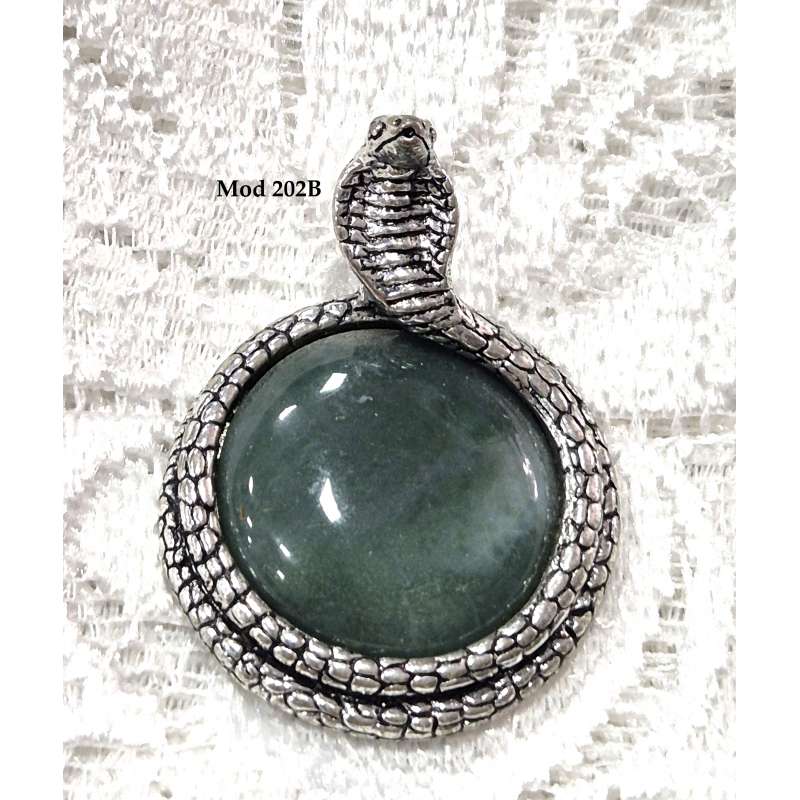 Está montada en peltre con forma de serpiente, tiene cadena de acero antialergico y que perdura sin cambio de color a pesar del tiempo.
