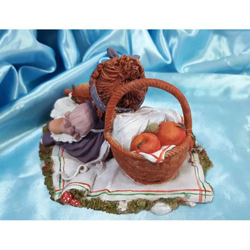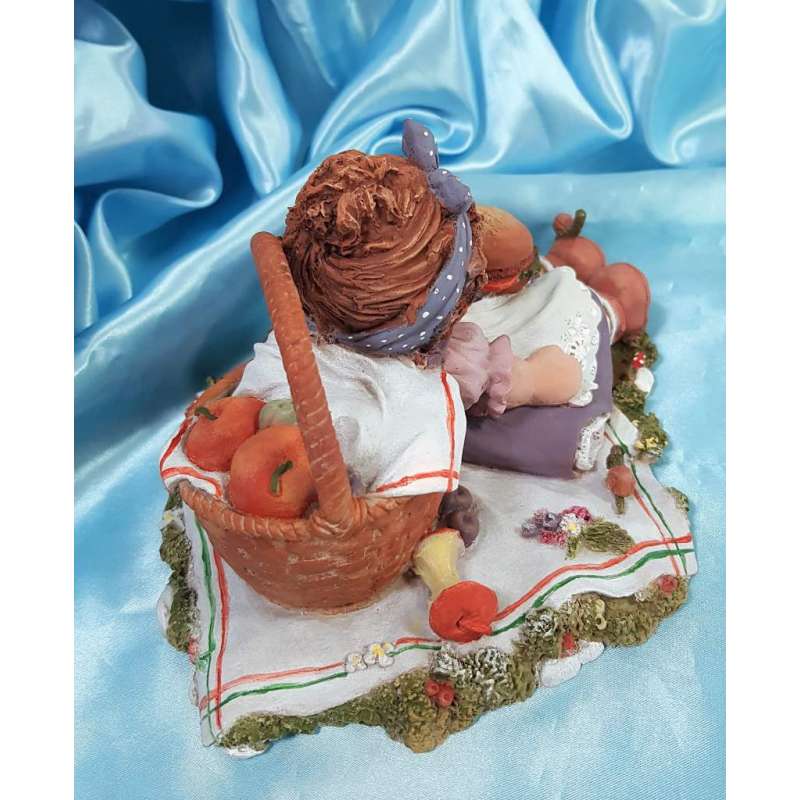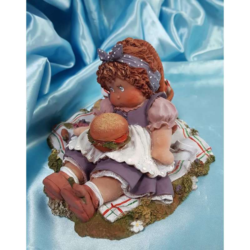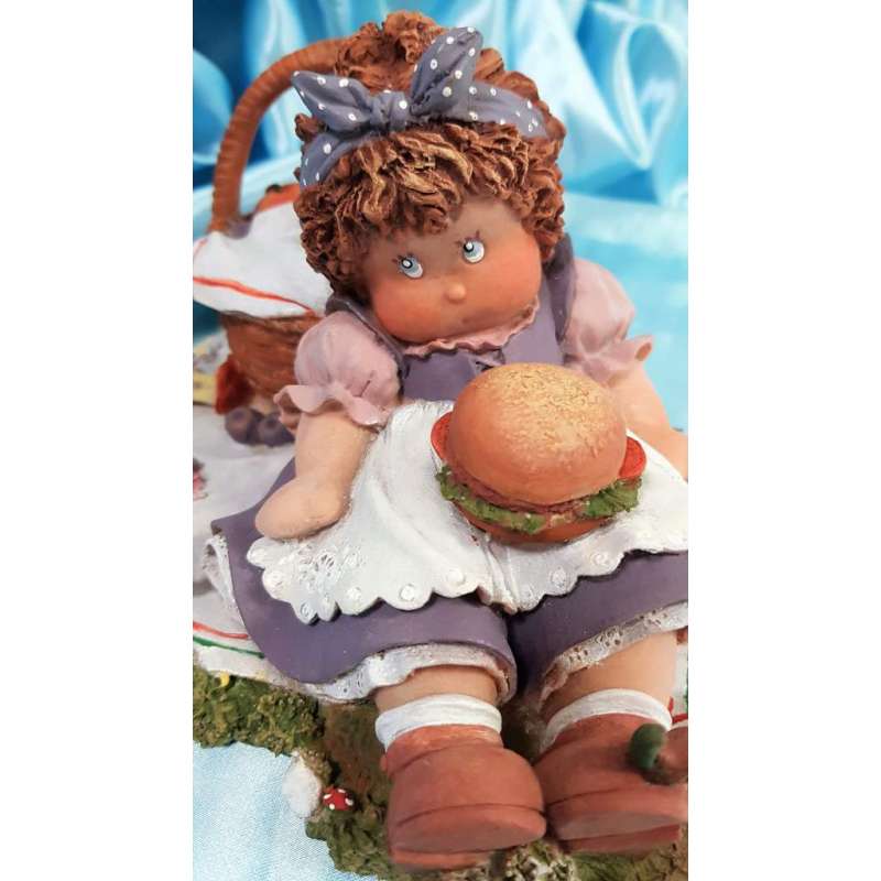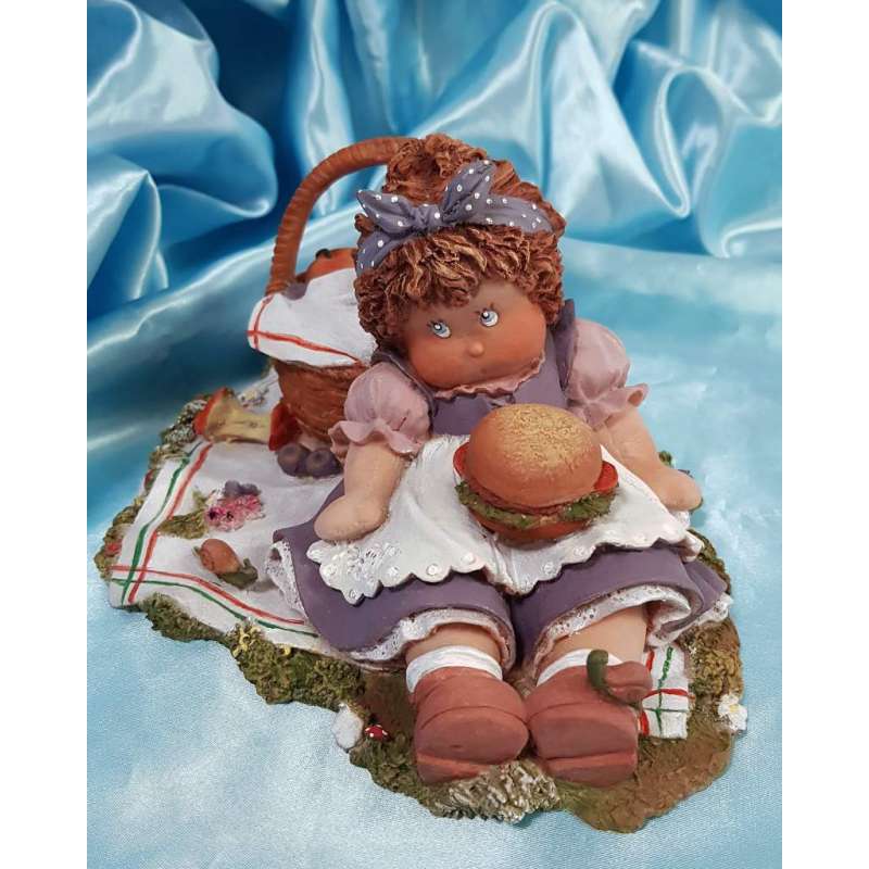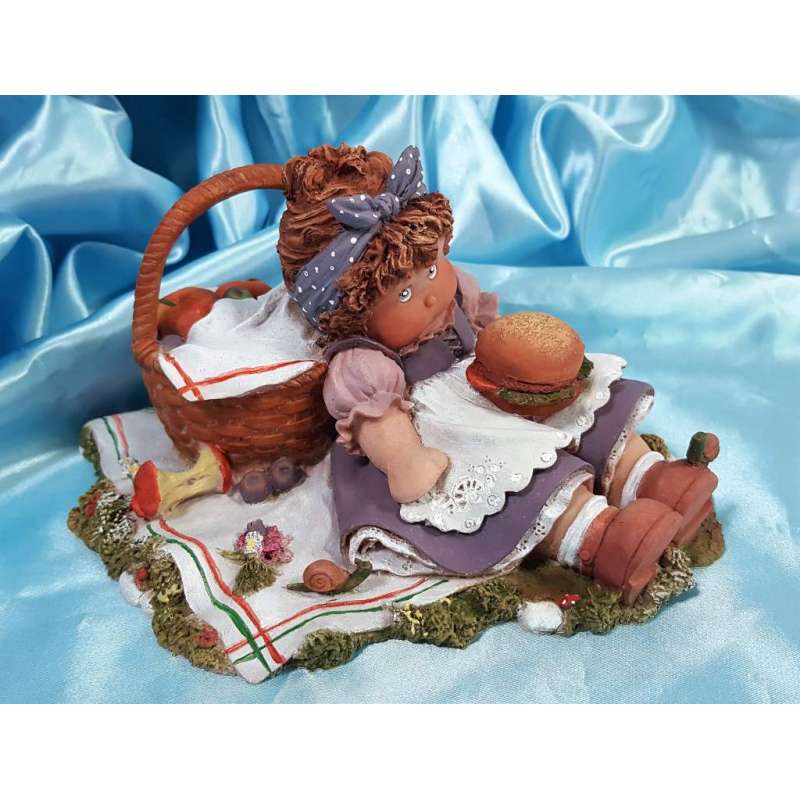 Una de las figuras mas tiernas de esta artista mallorquina que hace de su muñeca compañera de gran parte de su vida un arte muy entrañable, la figurilla está realizada en porcelana mate, moldeada y pintada completamente a mano por la autora, muestra a la muñeca en un dia de picnic en el campo, Cuqui se encuentra recostada sobre su cesta de mimbre, tiene sobre su tripita una deliciosa hamburguesa aunque se adelantó al postre y se lo comió antes por lo que se encuentra una manzana casi comida a su lado, esta obra está muy detallada, un caracol que está sobre el mantel, otro que tiene sobre su zapato, el cancán y el mandil de encaje, el mimbre de su cesta de merienda, hay muchos detalles.