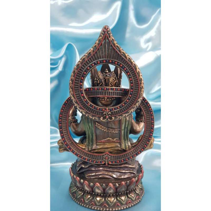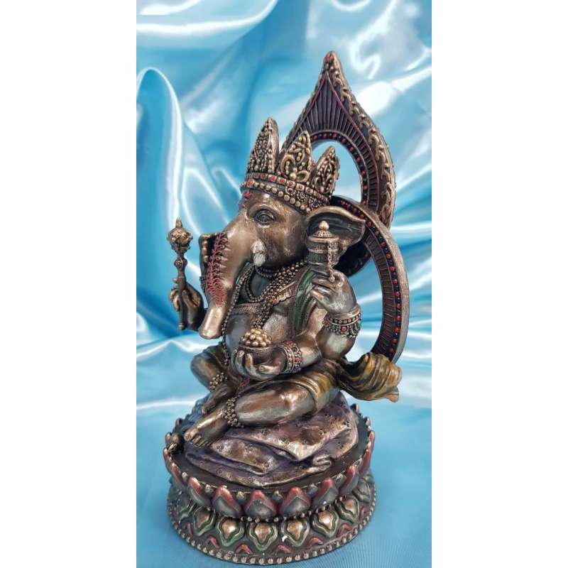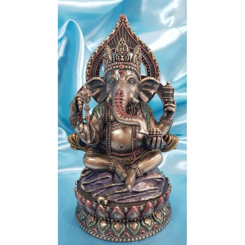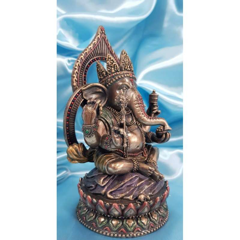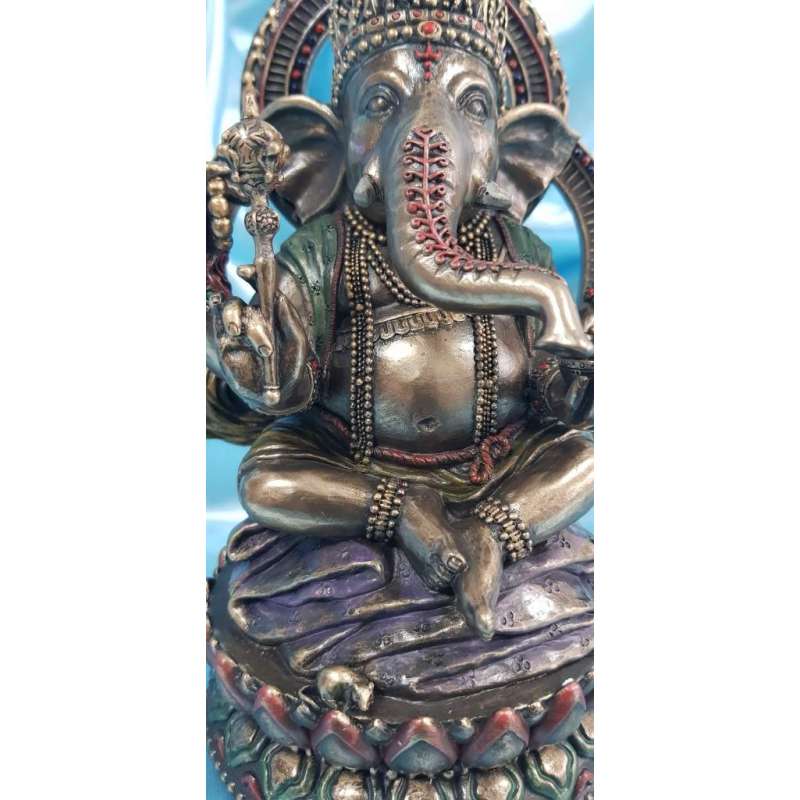 Moldeado y pintado completamente a mano de una mezcla de polvo de bronce y porcelana fría, recubierto en metales nobles y un toque de color que le da vida a esta escultura del dios ganhes, especial para regalar a personas que amen la mitologia hindú.