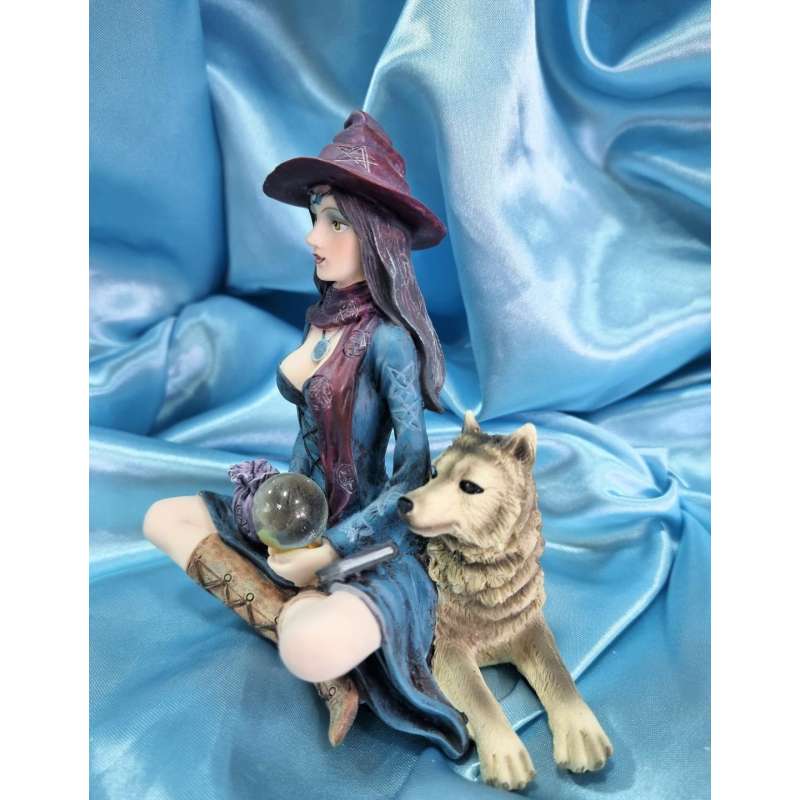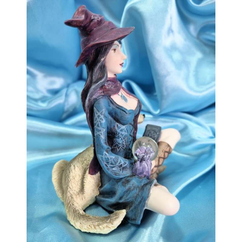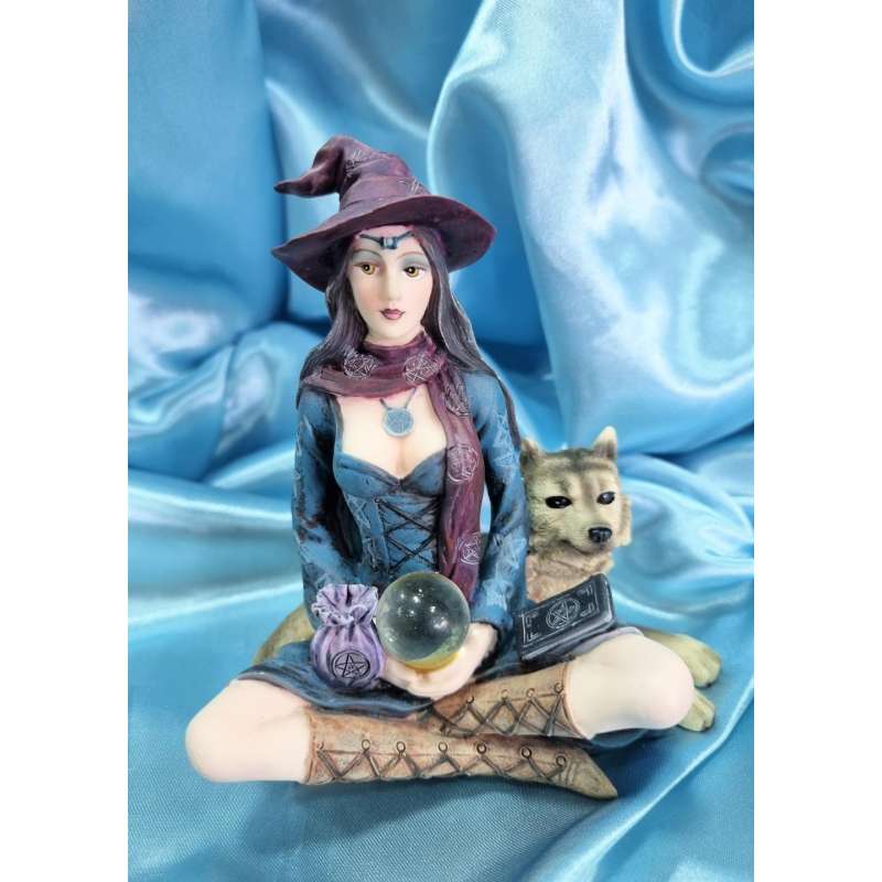 "Freya la bruja psíquica" es una pequeña pieza preciosa que mide aproximadamente 12 cm de alto. Ella está finamente moldeada en resina de alta densidad y artísticamente pintada a mano a un nivel muy alto. Freya es parte de la colección de la bruja blanca