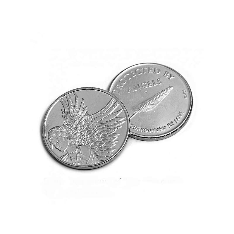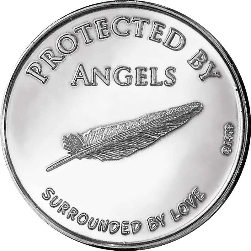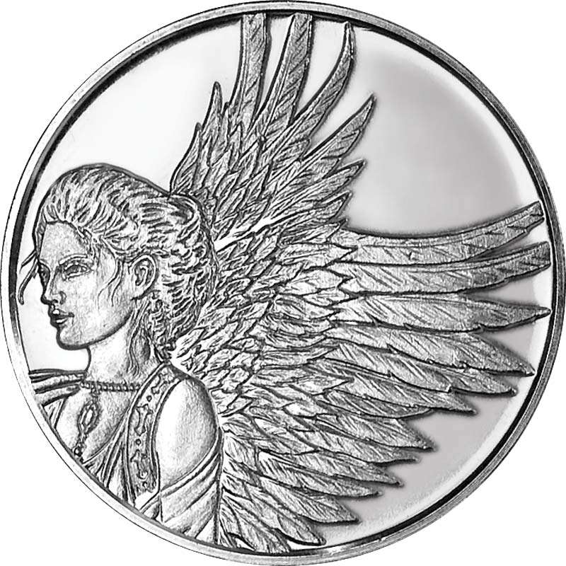 La moneda muestra un bellísimo Ángel con unas alas imponentes, en el reverso una pluma con dos frases inscritas: