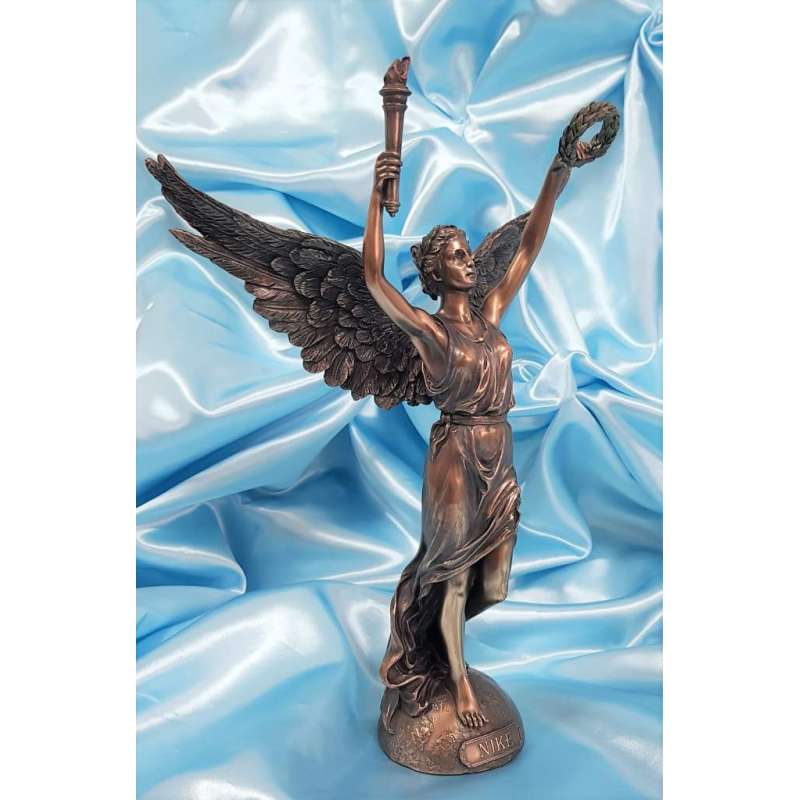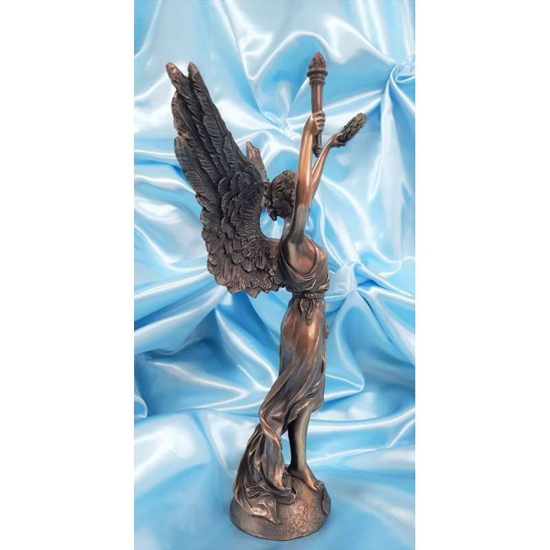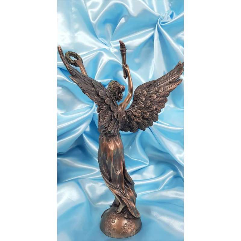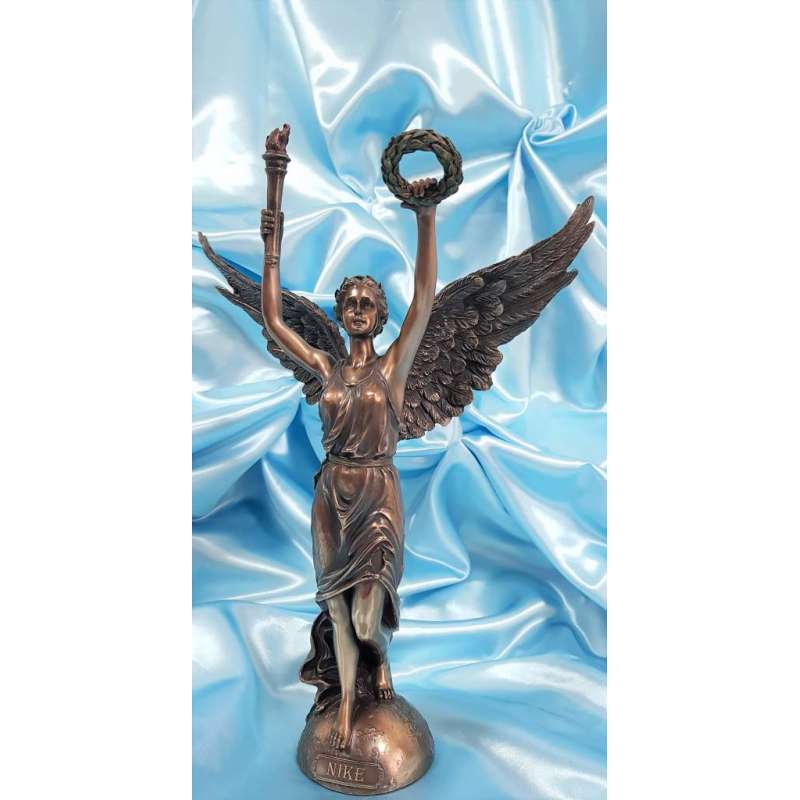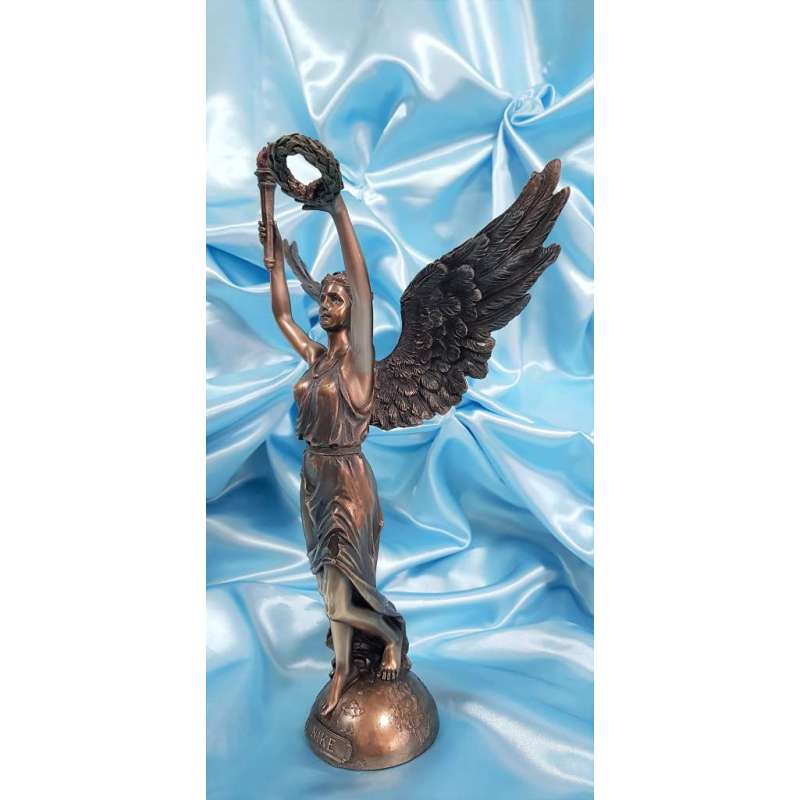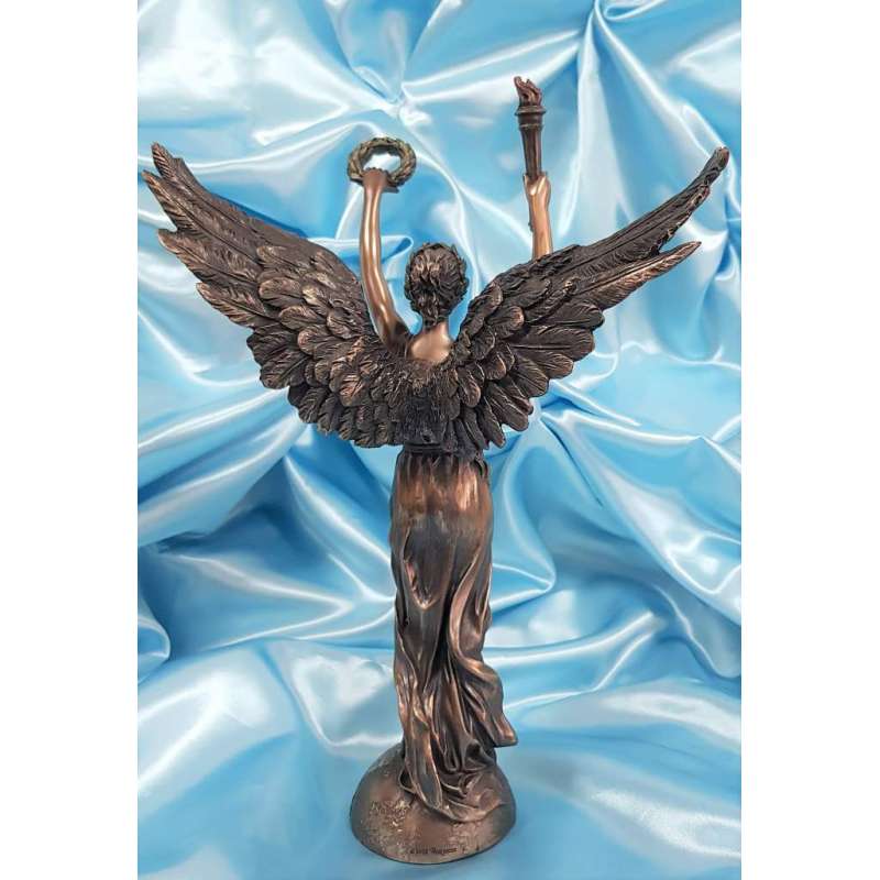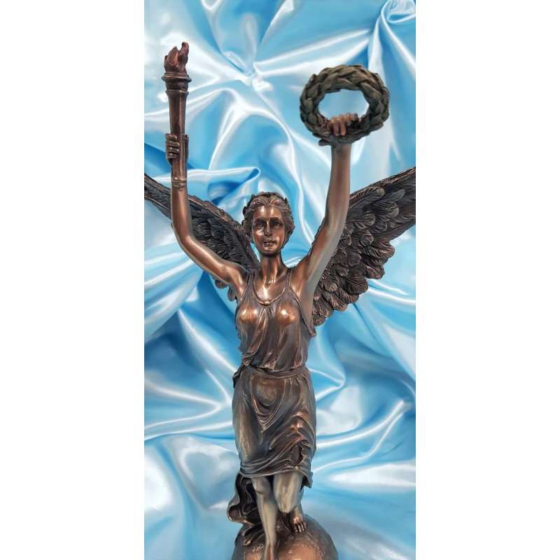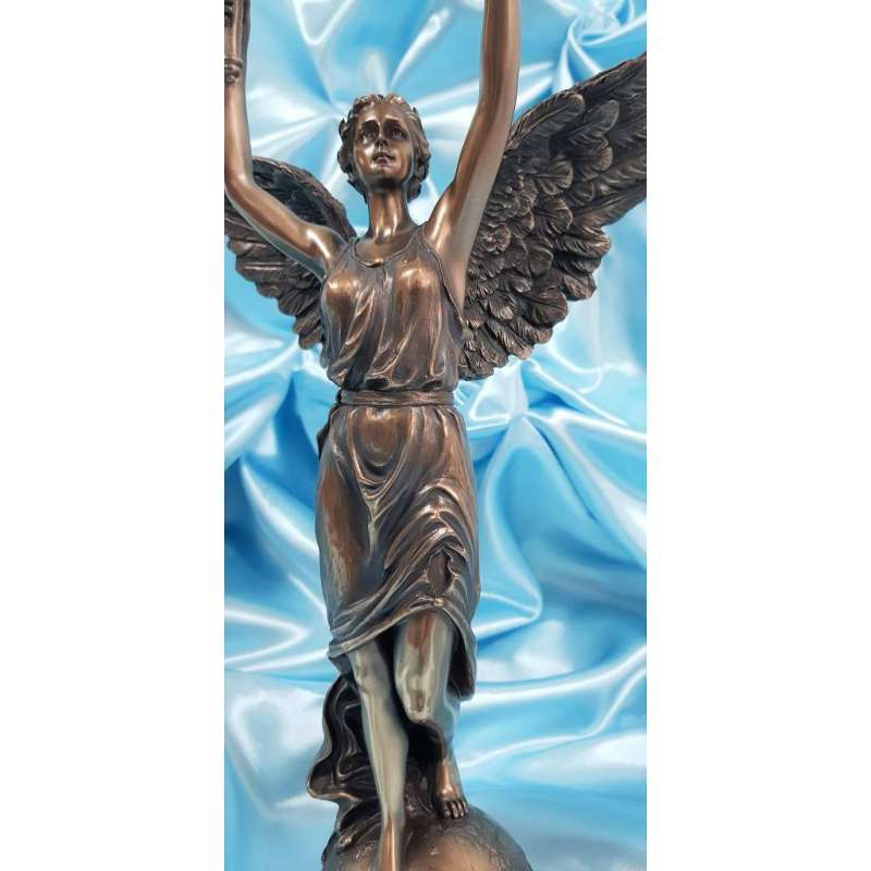 Esta hermosa escultura de la diosa Nike está realizada en una mezcla de polvo de bronce y porcelana fría, dándole mayor peso, resistencia y calidad y una apariencia de obra de arte sensacional.