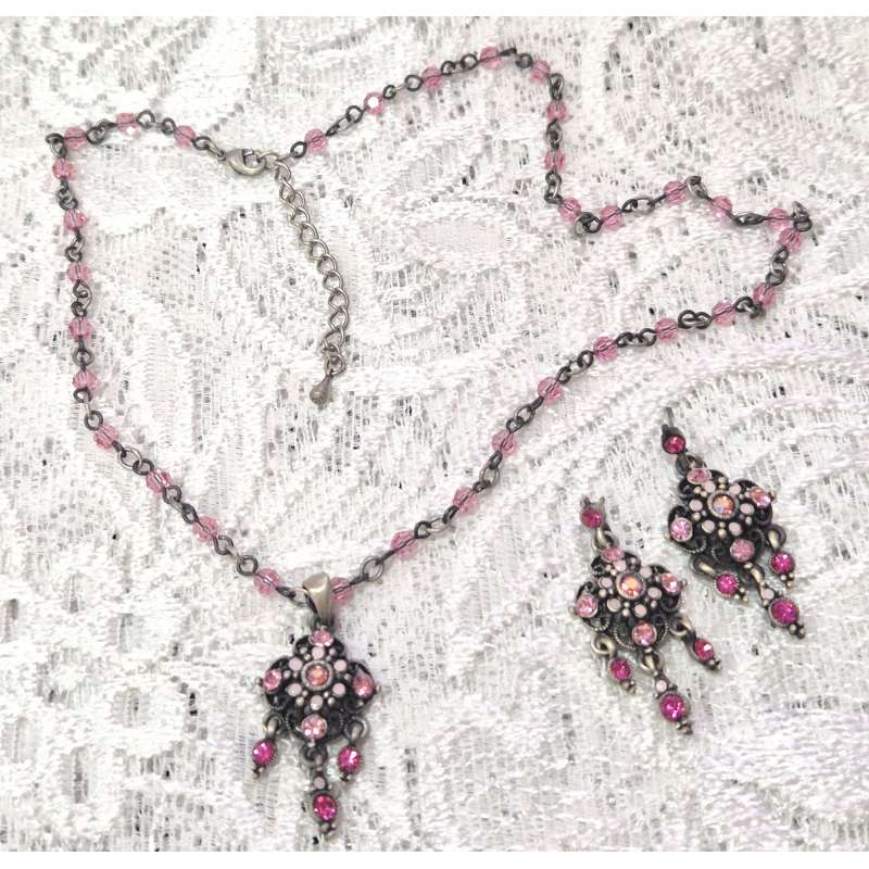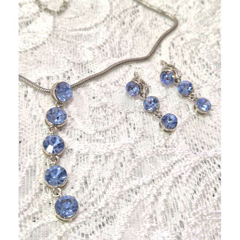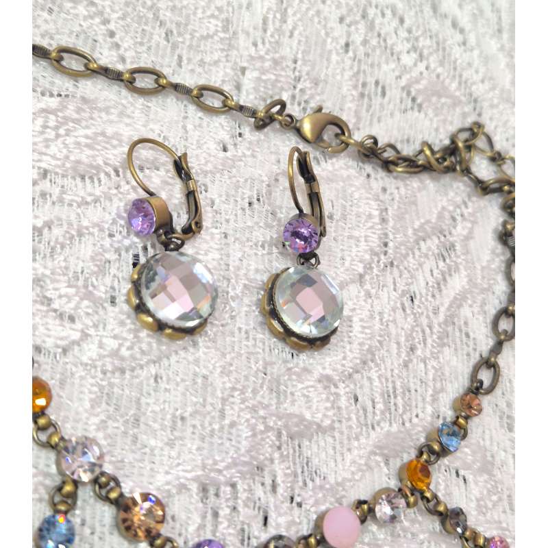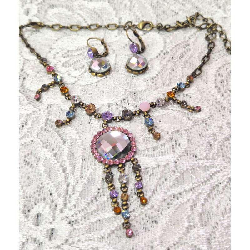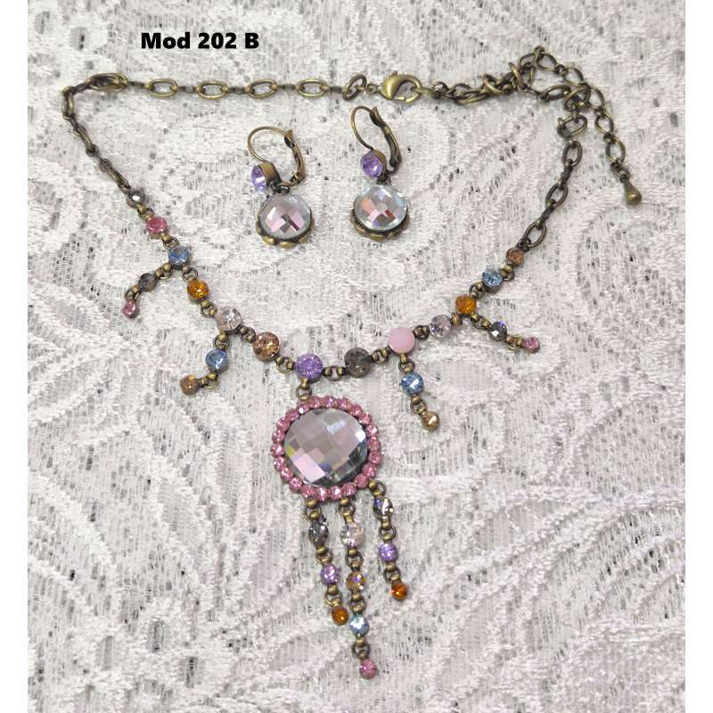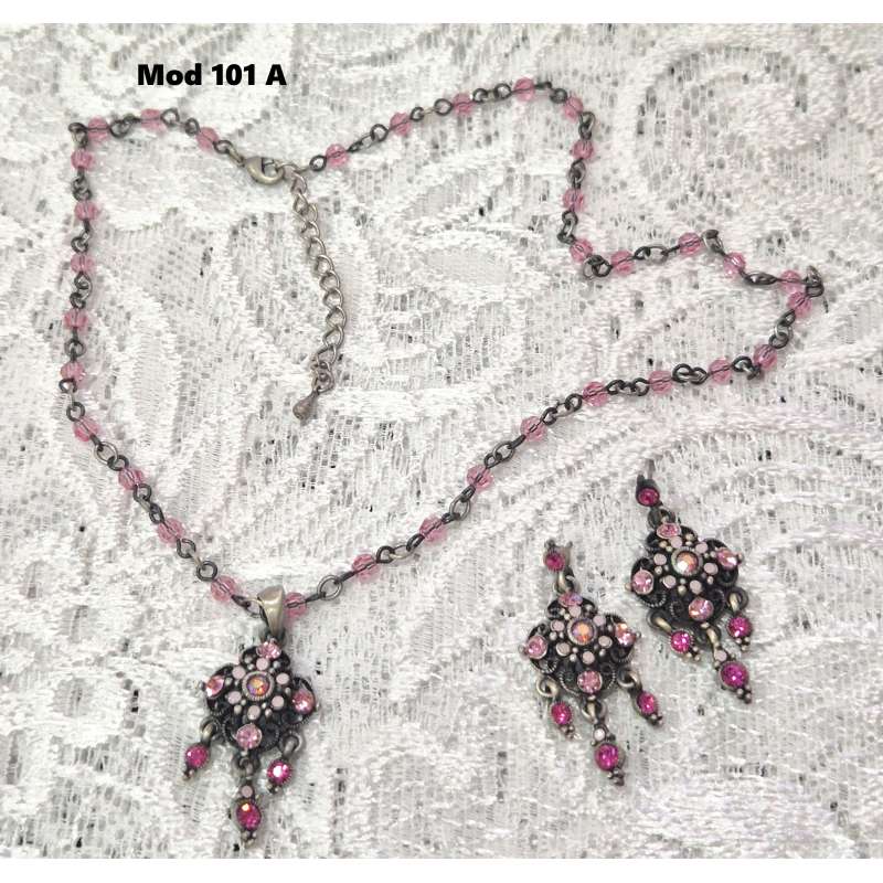 Bellos conjuntos de pendientes y gargantilla, realizado en rodio envejecido antialergico con cristal austriaco de primera calidad.