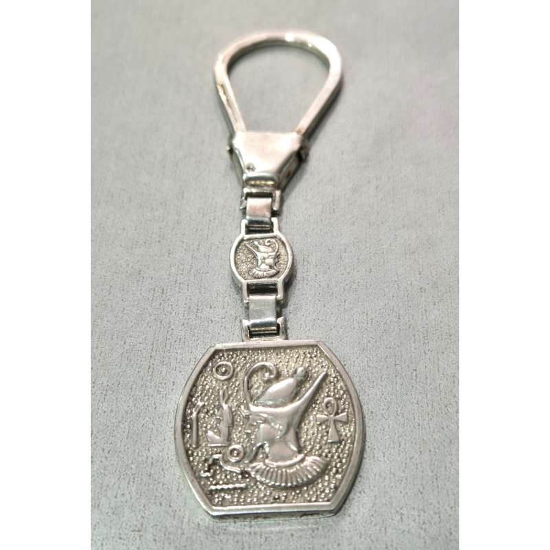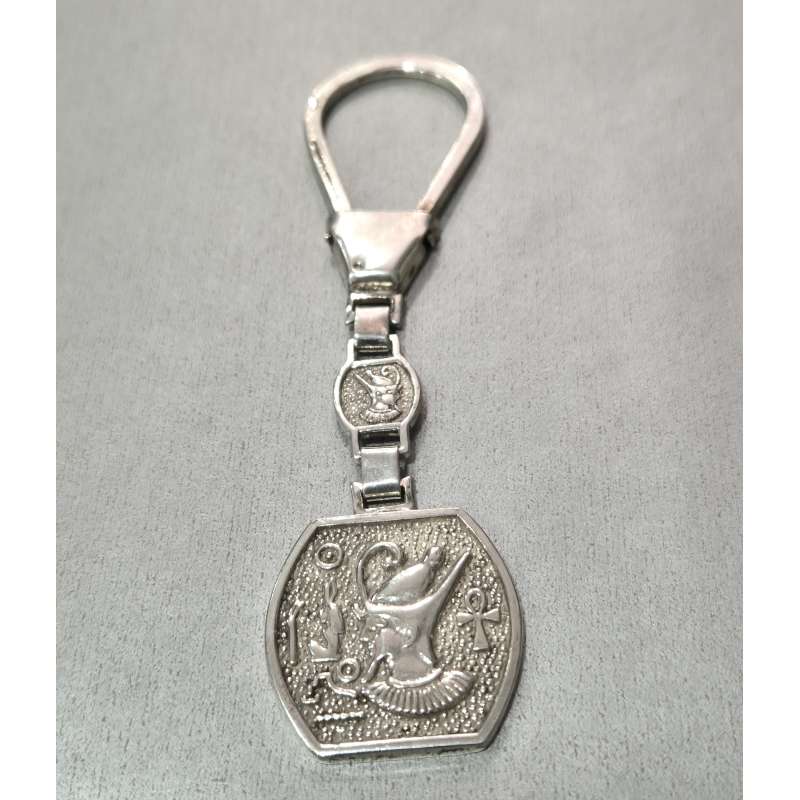 Llavero realizado en plata de ley 925 maciza por artesanos orfebres egipcios con manos prodigiosas y técnicas milenarias del tiempo de los faraones. Un regalo muy especial para el ser querido amante de la mitologia egipcia. Se envía preparado para regalar en una presentación exclusiva. Medida: Largo total con anilla, cadena y busto del faraón 11 cm (chapa grande del faraón 3 X 3 cm, chapa pequeña 1 X 1 cm)