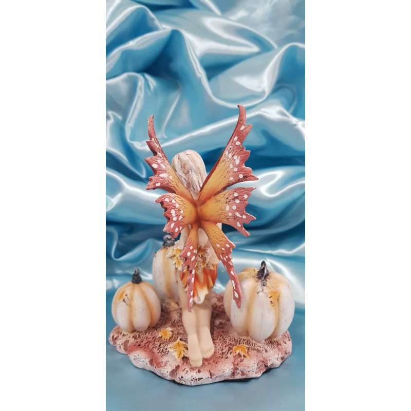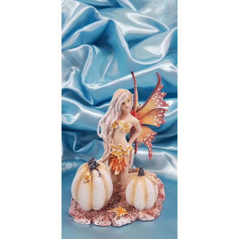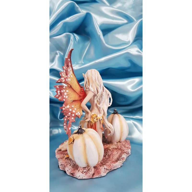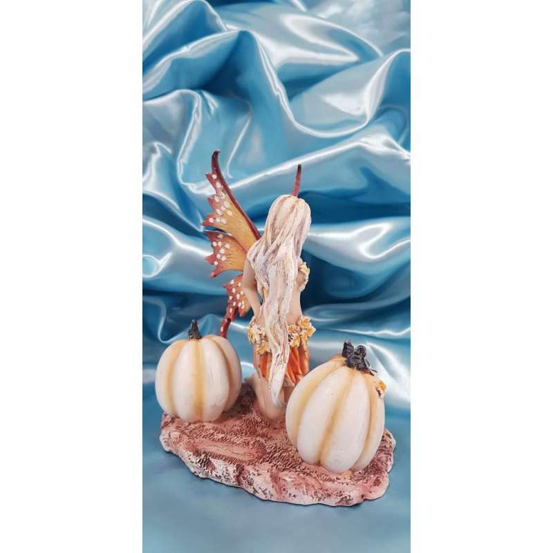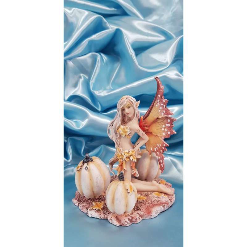 Una preciosa figura de un hada arrodillada junto a unas calabazas de Otoño, ella sonrie con mirada picara. Viste con motivos referentes a la estacion de Otoño.