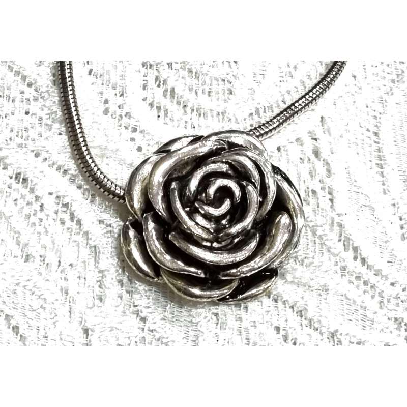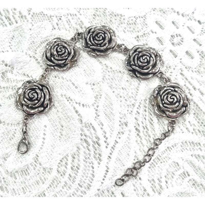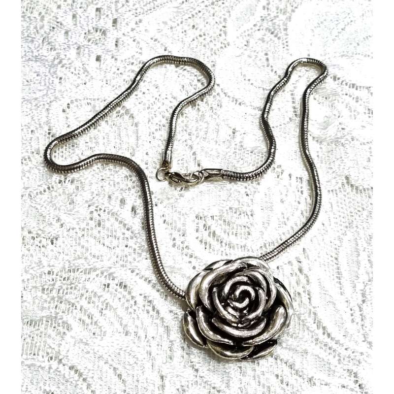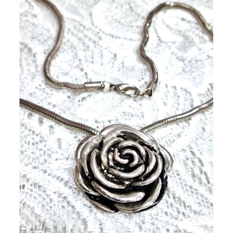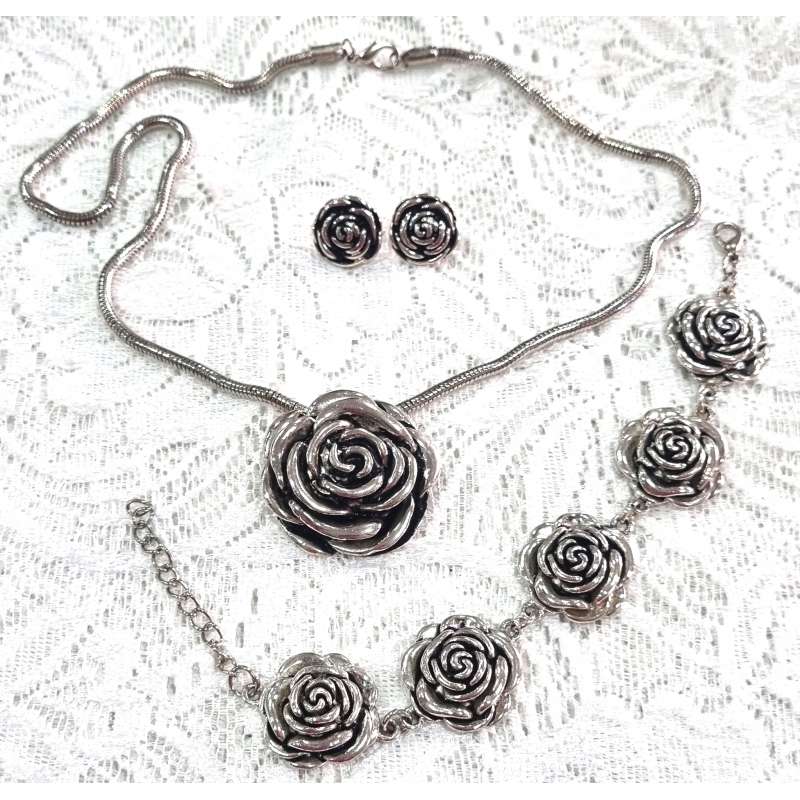 Un bonito conjunto de colgante, pulsera y pendientes de botón, realizados en bisutería antialergica, una rosa abierta elegante y sencilla para que la luzcas en ocasiones especiales como en momentos casuales.