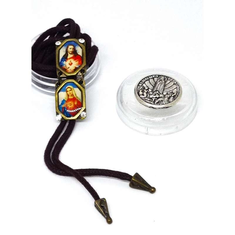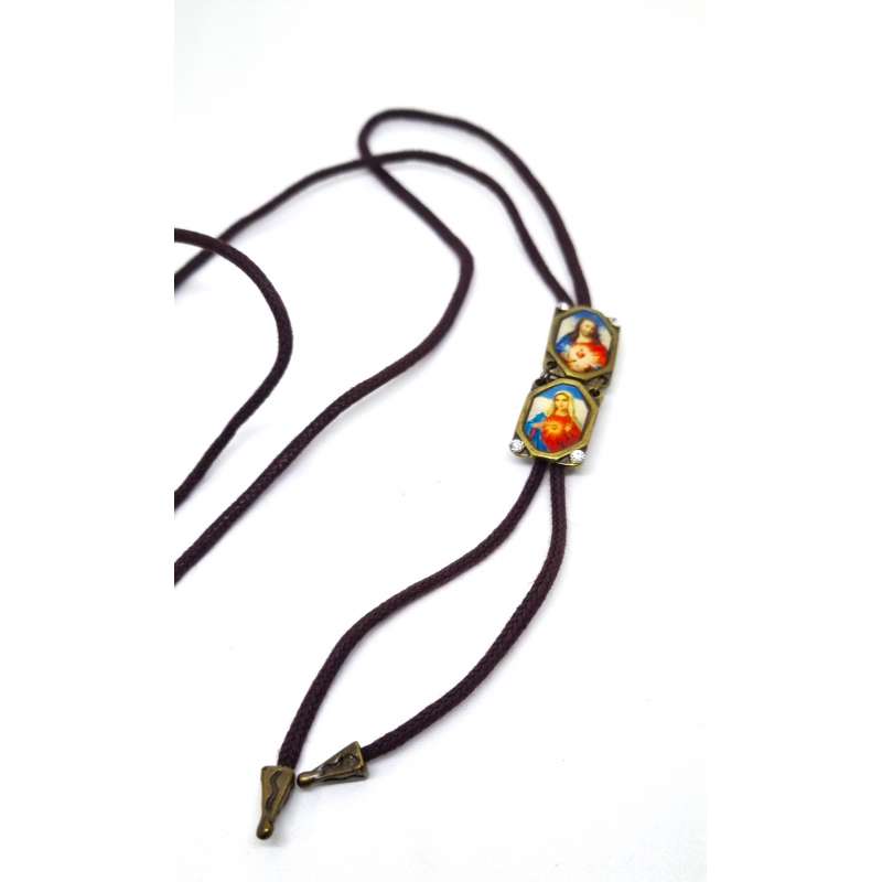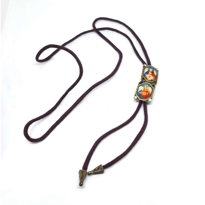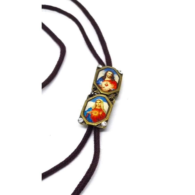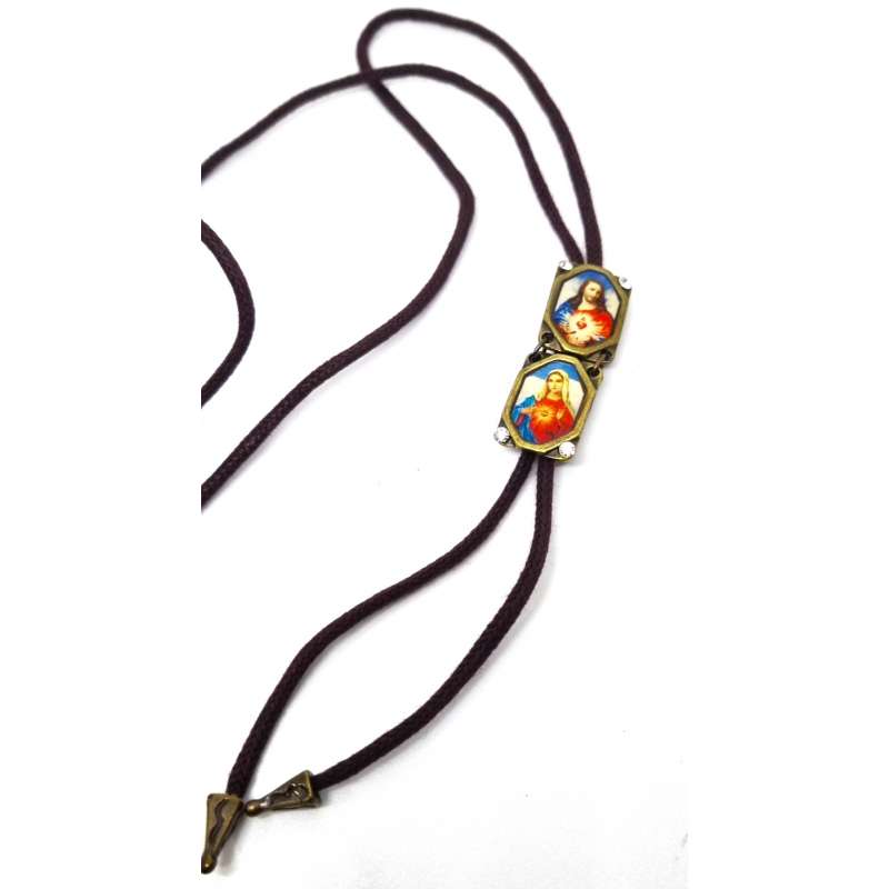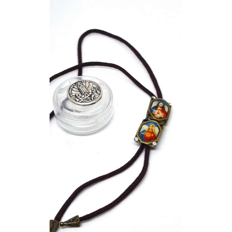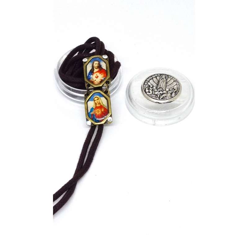 Escapulario de nuestra Sagrado Corazón de Maria y el Sagrado Corazón de Jesús, realizado en mental envejecido y cordón de algodón.