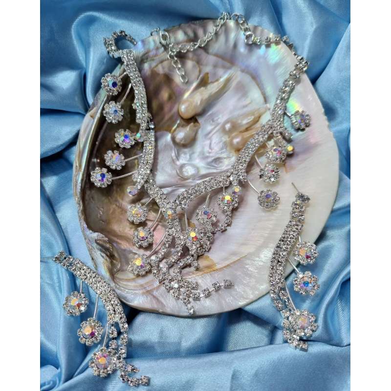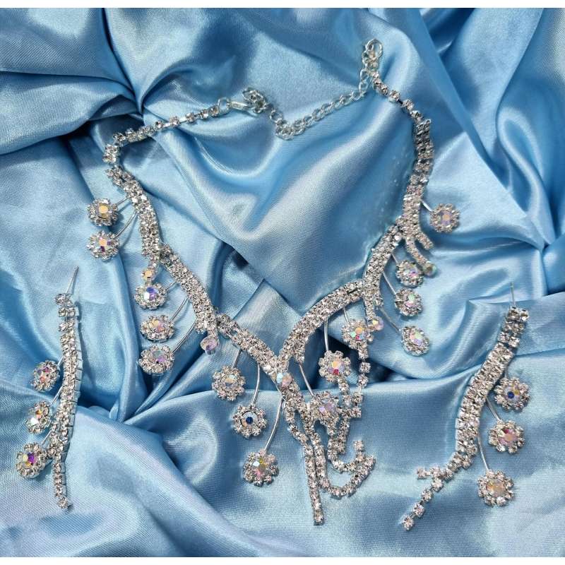 Collar y pendientes a juego fabricado en pequeños cristales de strass formando flores y estelas engastados en rodio antialergico, original diseño de estelas de flores sujetas en un collar, queda espectacular adornando el cuello, con cierre de mosquetón con una pequeña cadena para que te lo pongas a cualquier medida de cuello, con un par de pendientes a juego, el sistema de cierre en con tuerca, diseño original que captura la esencia de la elegancia, ideal con cualquier peinado para que tenga un look esplendido, es de nuestra colección de joyas de alta bisutería para fiesta.