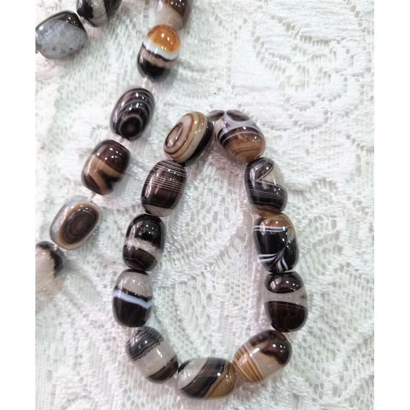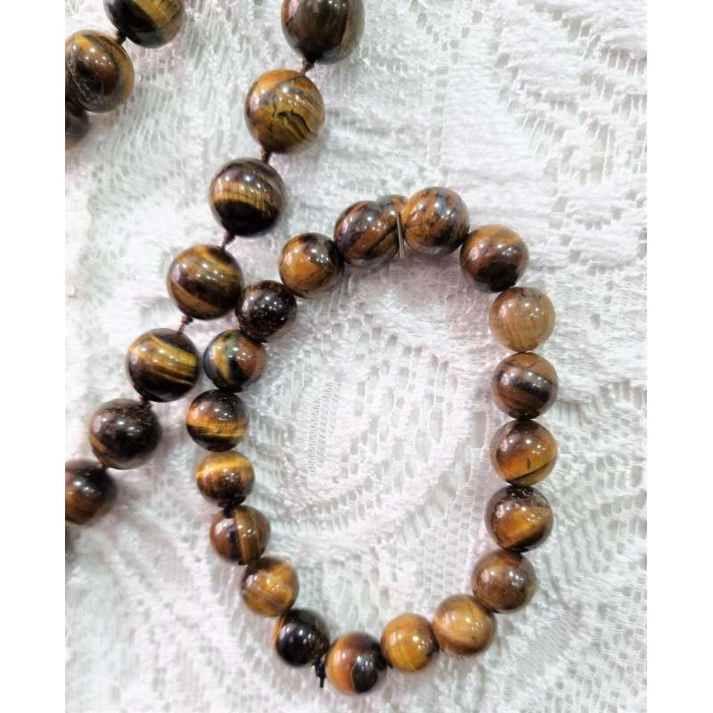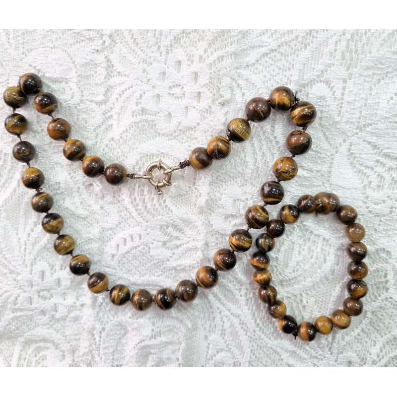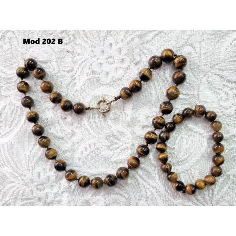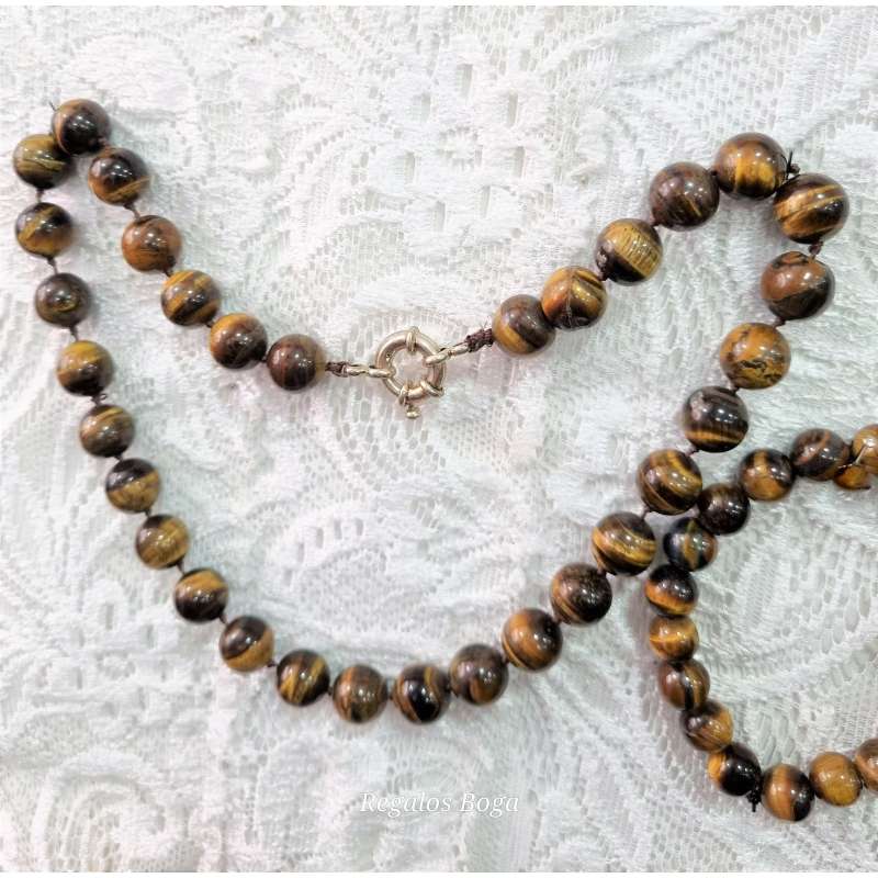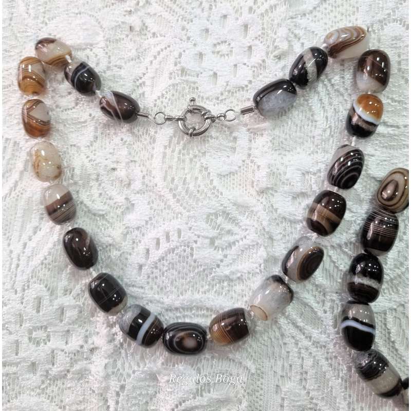 Gargantilla y pulsera realizada totalmente a mano en piedra natural ( Ojo de tigre, o ágata bostwana), y enfilado a nudo (piedra a piedra con nudo intercalado) con cierre de mosquetón sencillo y a la vez elegante.