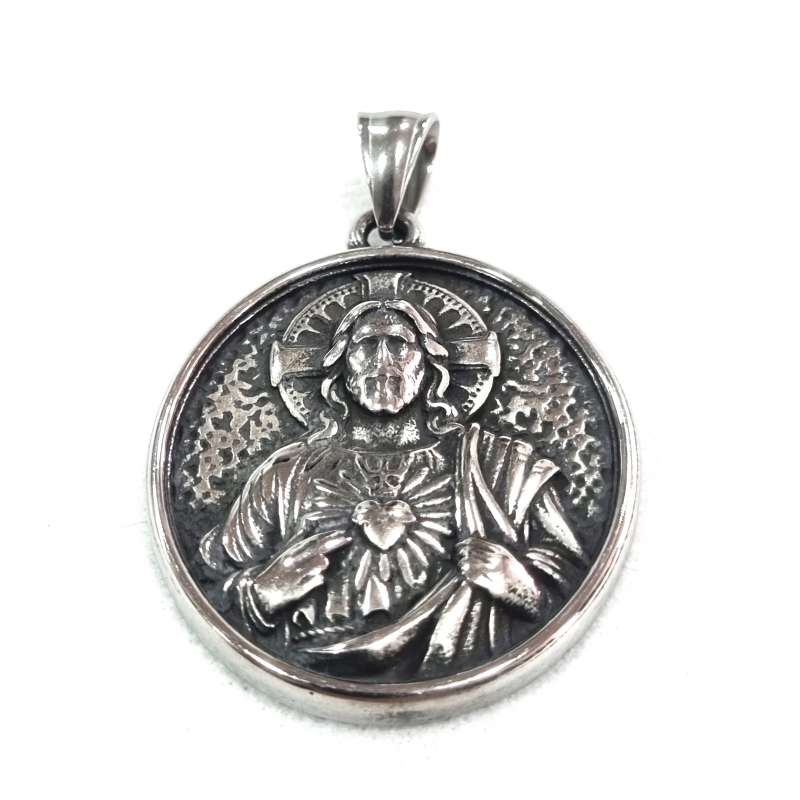 Colgante medalla del Sagrado Corazón de Jesús, acuñada en acero inoxidable envejecido.