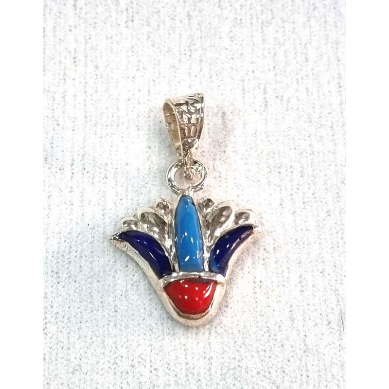El colgante de plata está en forma tridimensional, acabado con detalles en pasta turquesa, lapislázuli o coral.