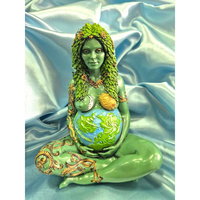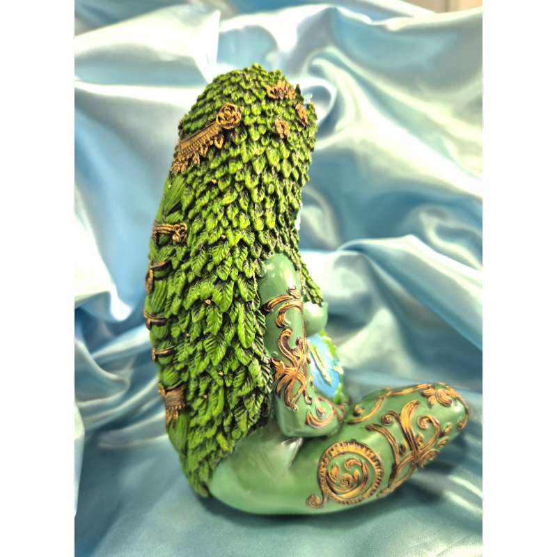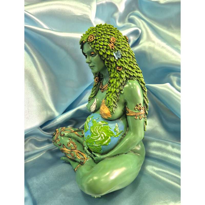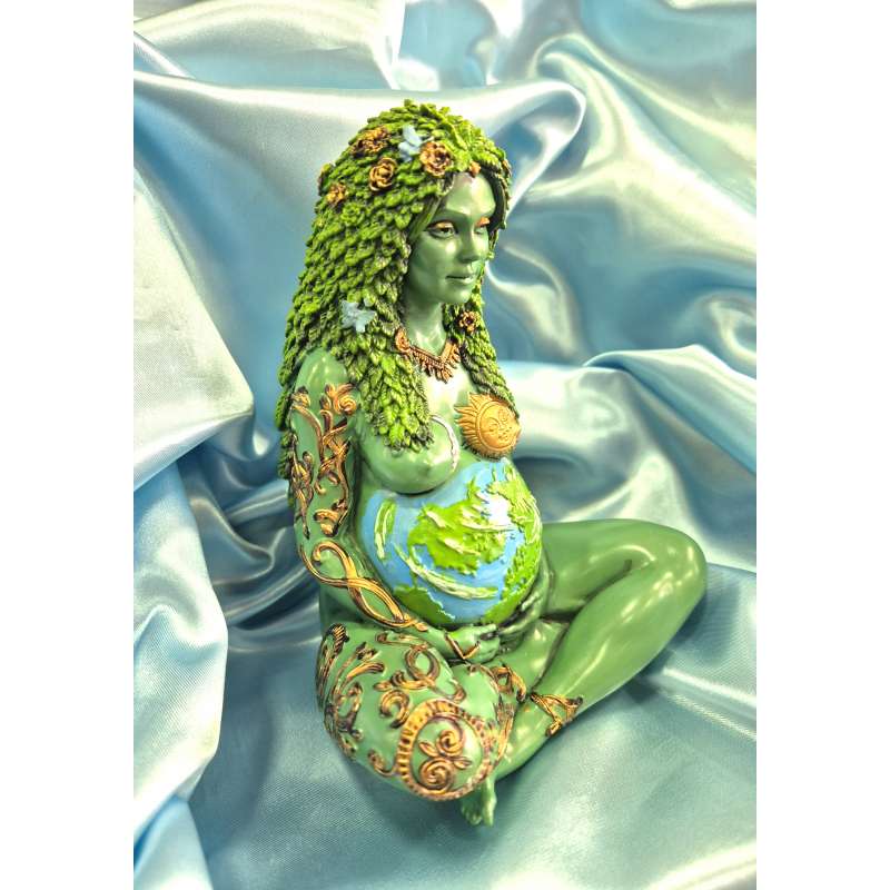 Estatuilla realizada completamente a mano en poliresina, la diosa de la tierra Gaia está pintada y moldeada artesanalmente por manos especiales, es ritualizada y bendecida utilizando magia blanca Wicca.