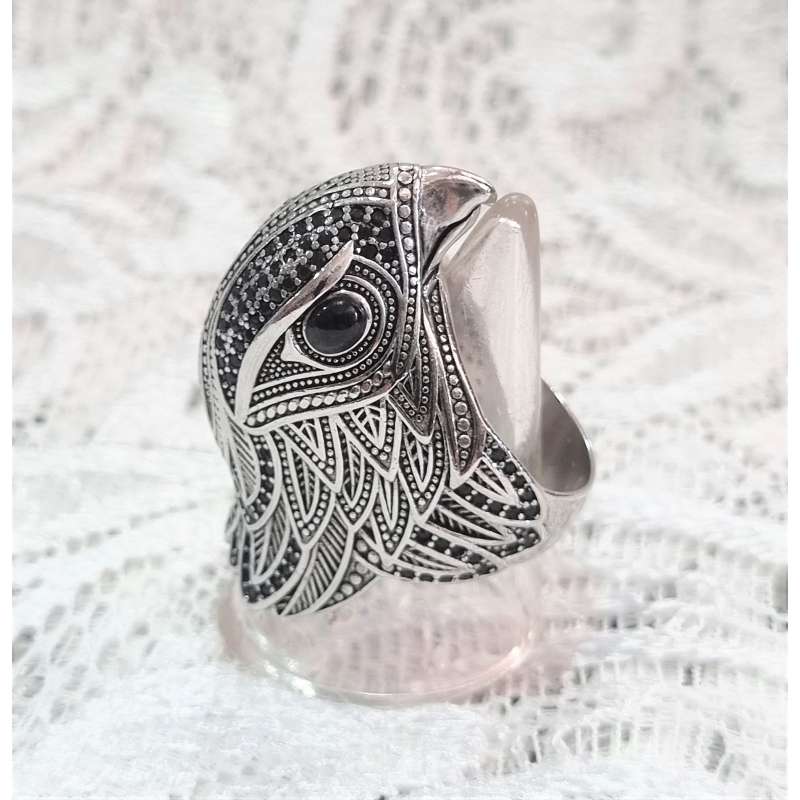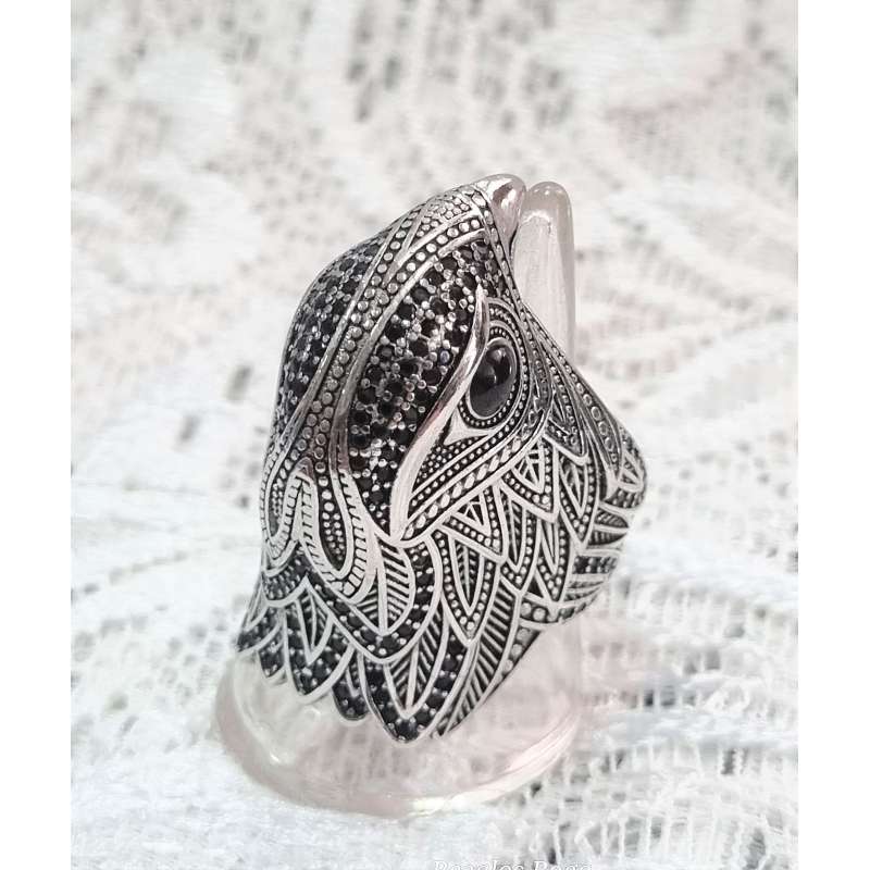 El gran halcón, mensajero de la luz que reina en los cielos de todo el mundo, un anillo elegante con una gran cabeza de Halcón que cautiva con sus penetrantes ojos de ónix y los destellos de su plumaje, confiriendo a todo look una expresividad extraordinaria.