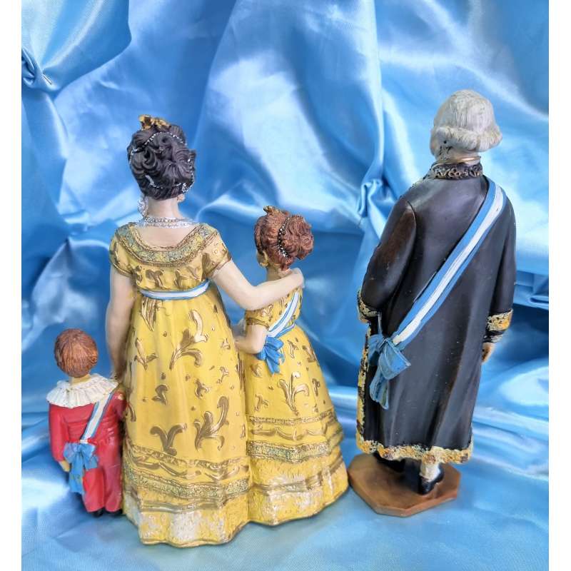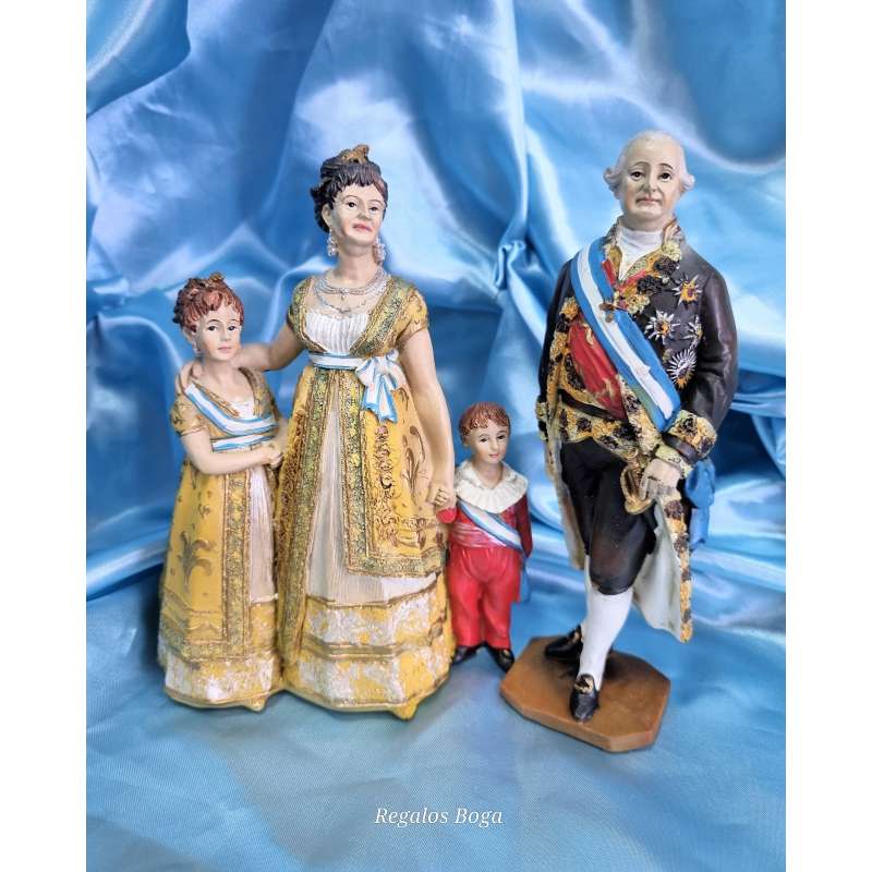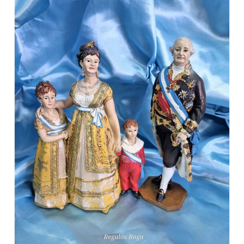 Figurillas realizadas en resina, moldeada y pintada completamente a mano con gran esmero en el detalle, muestra a cuatro miembros de la familia real que aparecen en el cuadro de este genial maestro de la pintura, retrato en el que aparece en primer termino la reina Maria Luisa pasando su brazo maternal sobre su hija Maria Isabel a la vez que coge de la mano al infante Don Francisco de Paula, el rey Carlos IV se encuentra a la derecha del retrato.