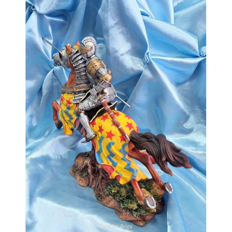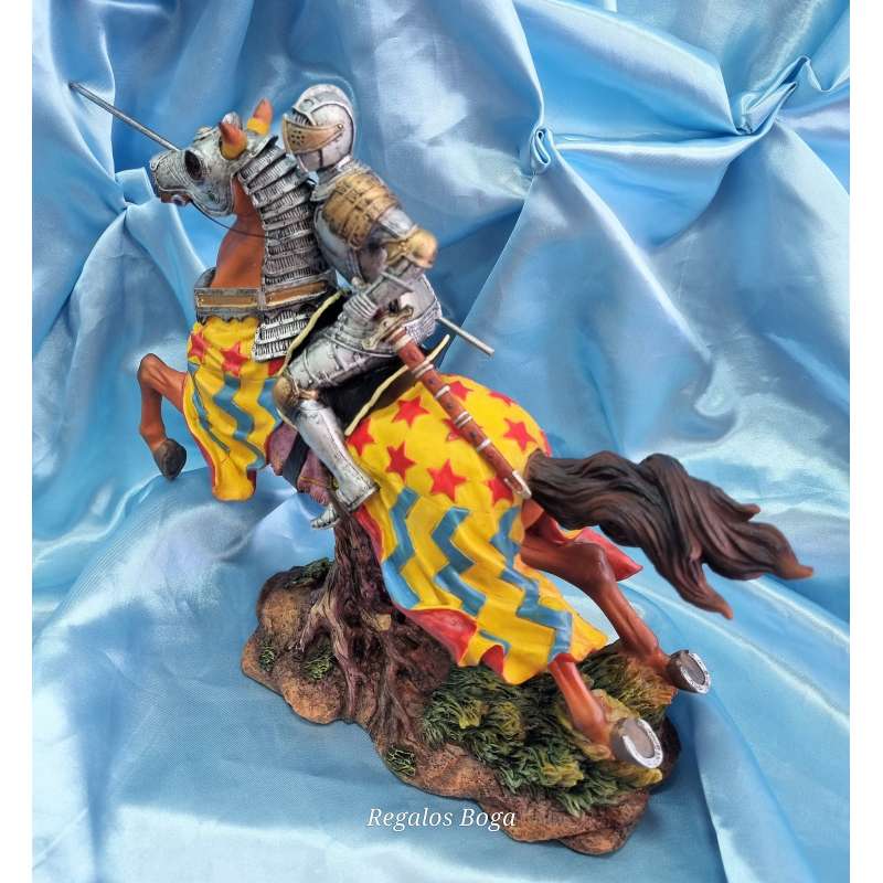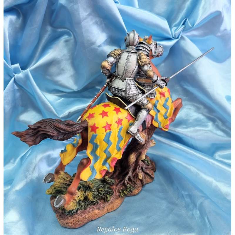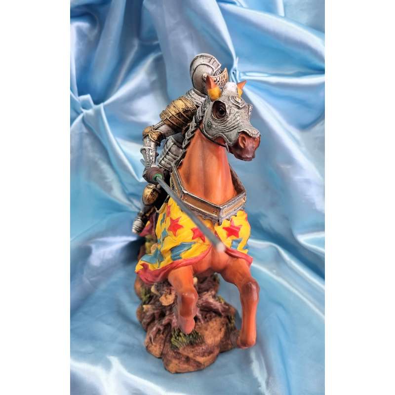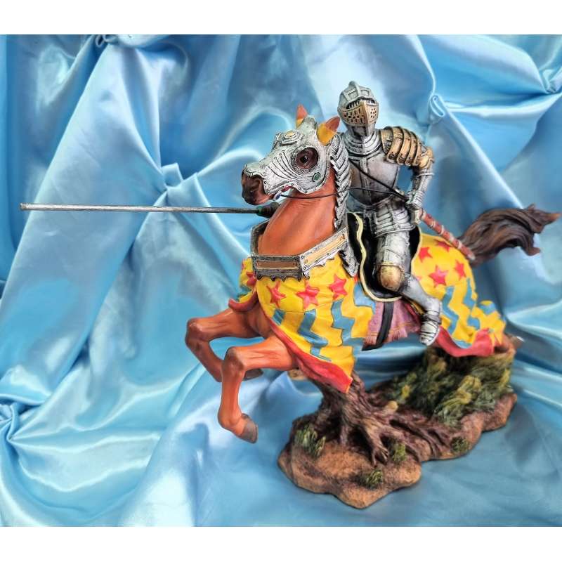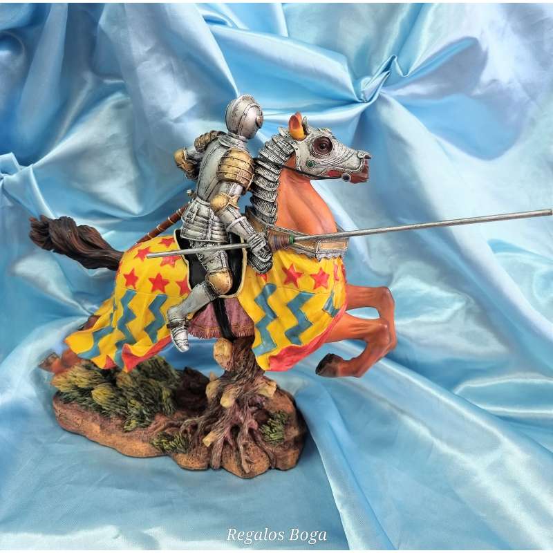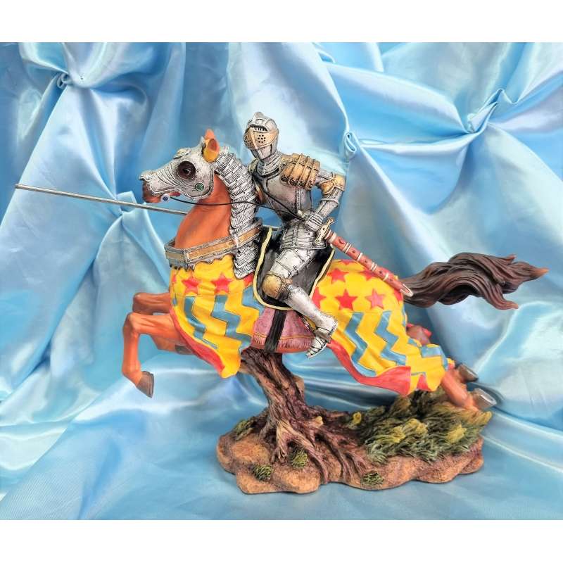 La figura está hecha de resina de alta calidad y presenta un Caballero medieval a caballo con armadura y lanza, el caballo lleva protección de armadura en su cabeza. Cada detalle ha sido cuidadosamente diseñado y esculpido a mano para asegurarse de que recibas una obra de arte de calidad. Además, su tamaño compacto significa que se adapta perfectamente a cualquier estantería, escritorio o mesa.