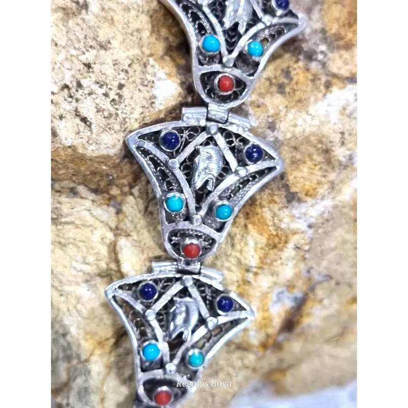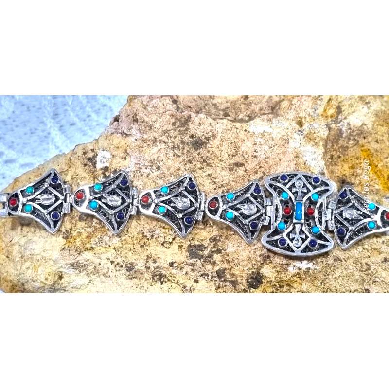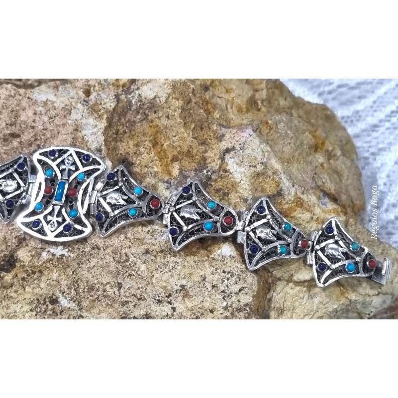 Este es un brazalete de una calidad encantadora que consiste en piezas en forma de flor de loto egipcia con la cabeza del faraón Tut, encajadas con bisagra unidas alrededor de la circunferencia del brazalete. En las piezas hay motivos de piedras naturales engastadas formando bellos adornos de colores ( el rojo es coral, el azul claro es turquesa y el azul oscuro lapislázuli ) con la cabeza del faraón en todos las piezas y un hermoso grabado ornamentado en la plata. Tiene bisagras y se abre con clips en el costado con un cierre a presión seguro integrado en el brazalete.