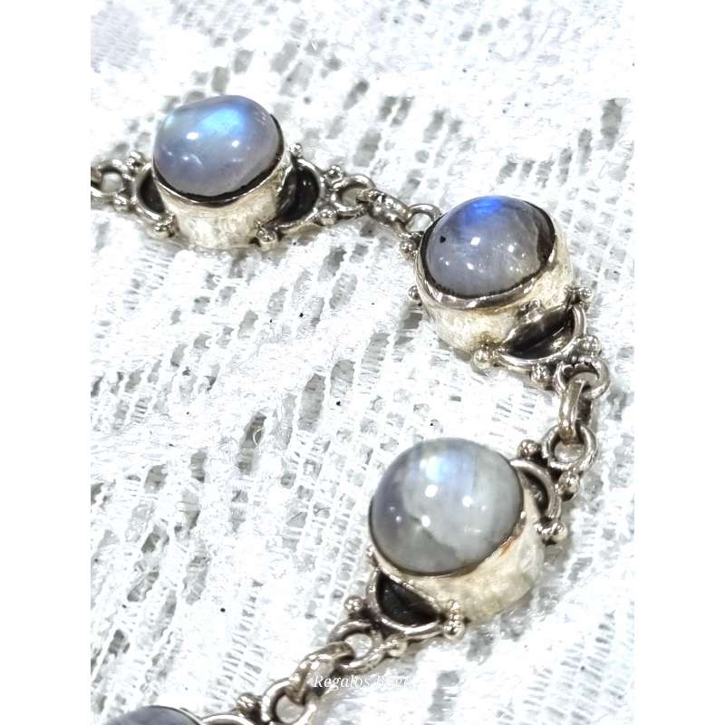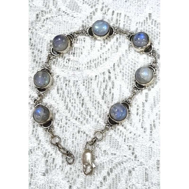 Pulsera con siete piedras de luna talladas en cabujón ovaladas y montadas en plata de ley totalmente a mano por artesanos orfebres con magia en sus manos. Cierre de mosquetón y cadena de eslabones para hacerla ajustable.