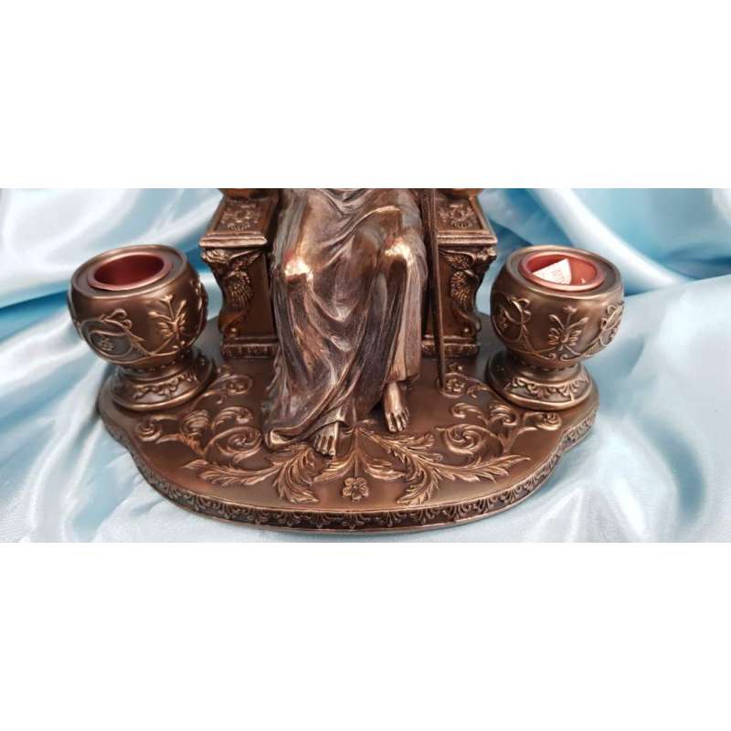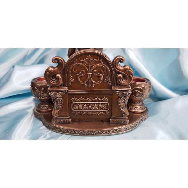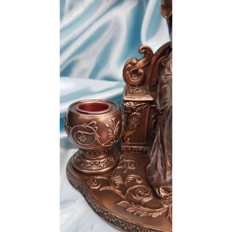 Esta bella escultura de aspecto antiguo está realizado en una mezcla de polvo de bronce y porcelana fria, moldeada y pintada a mano por la prestigiosa firma símbolo de calidad Veronese Studio Collection con gran calidad en el detalle, también sirve de candelabro con los dos pequeñas ánforas que rodean la estatua.