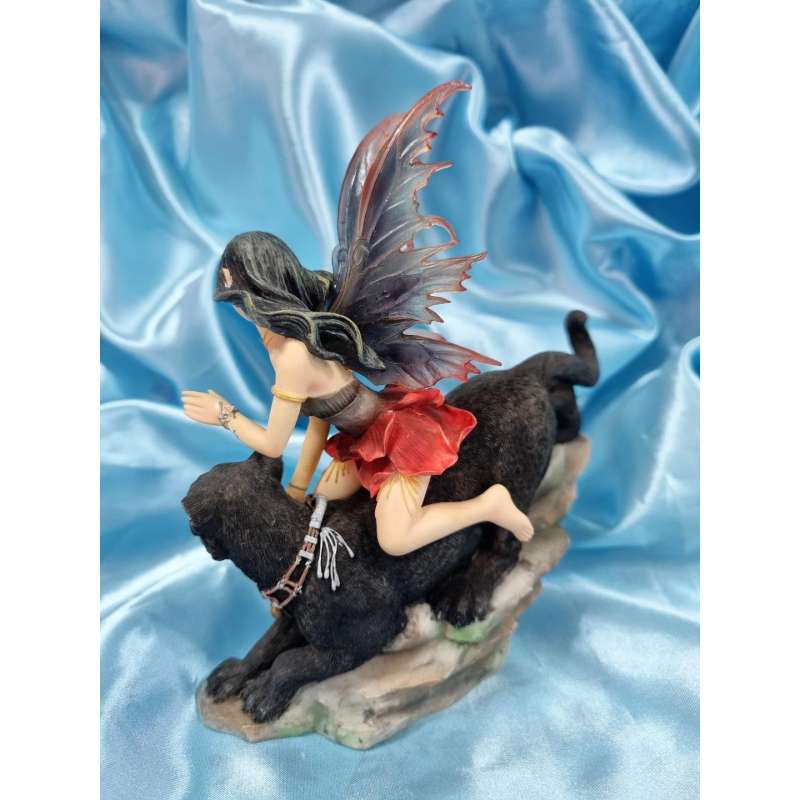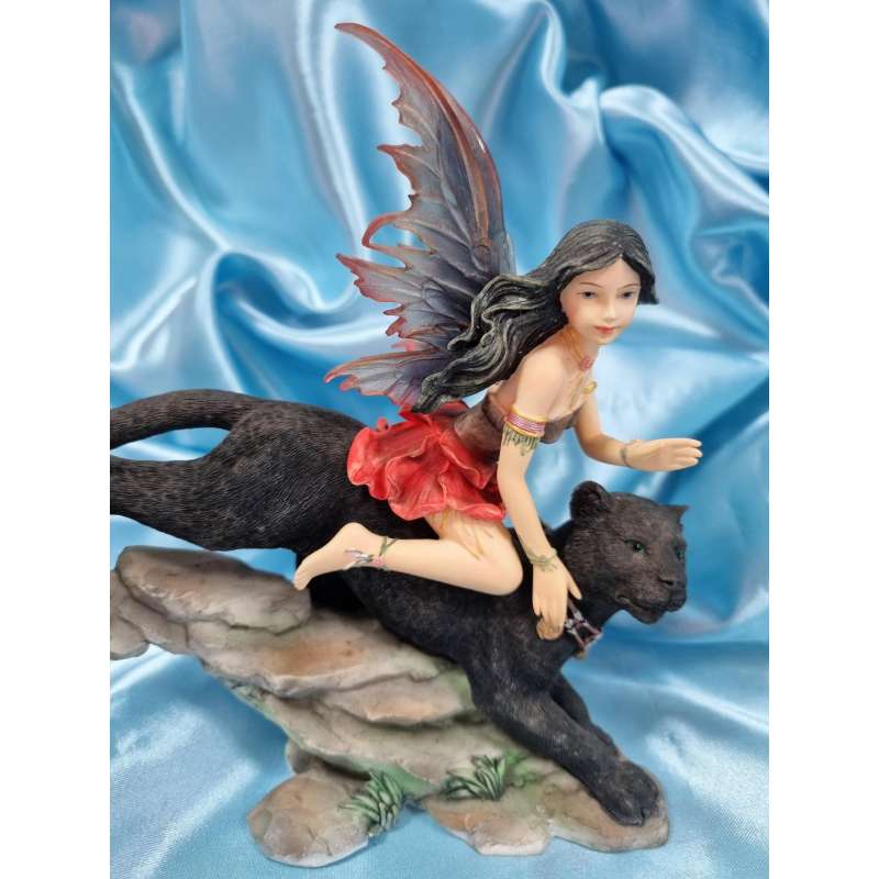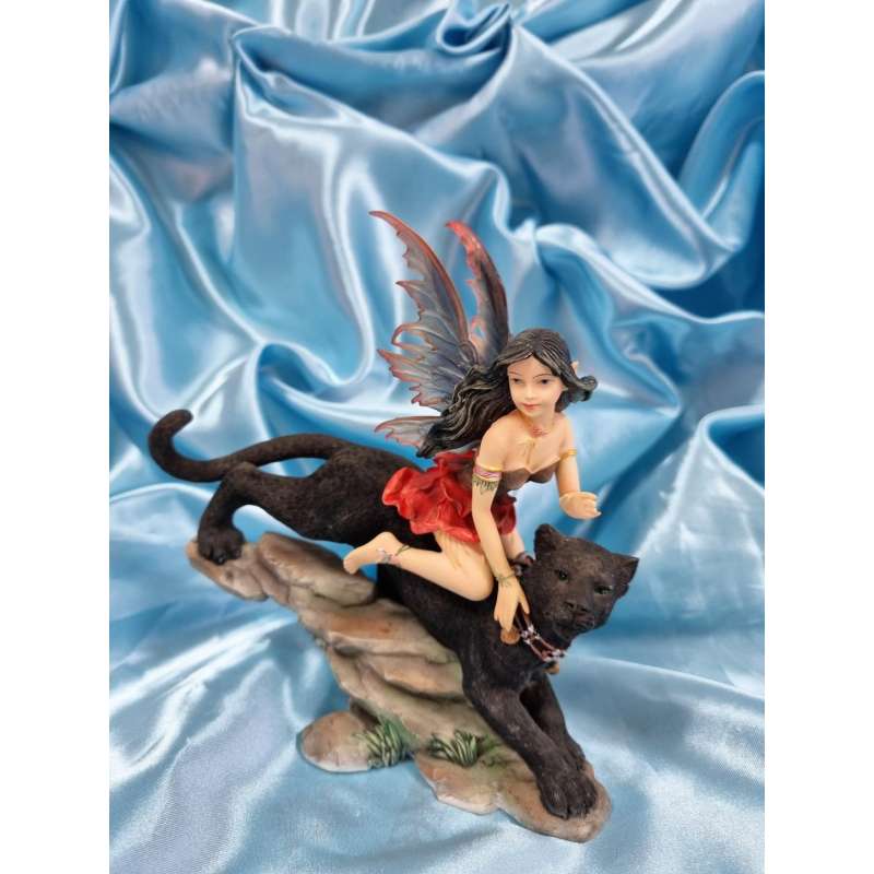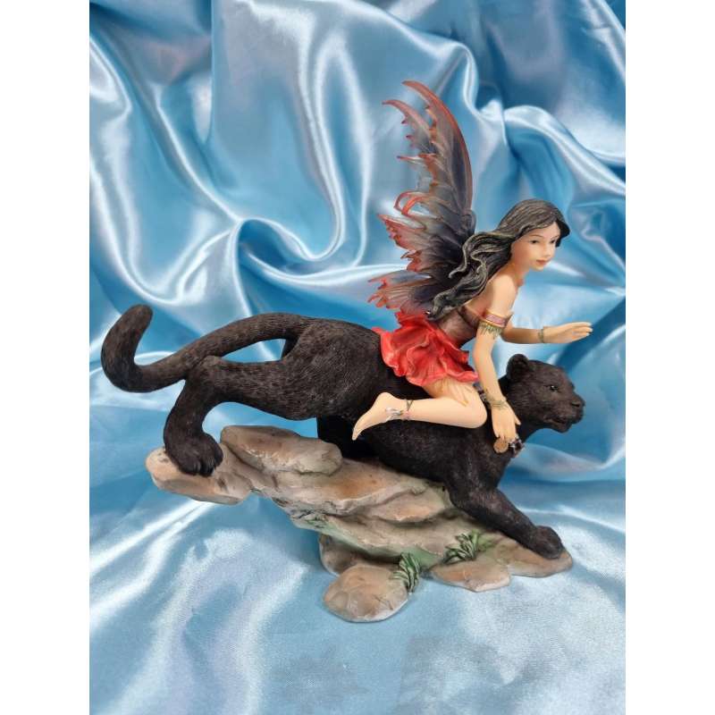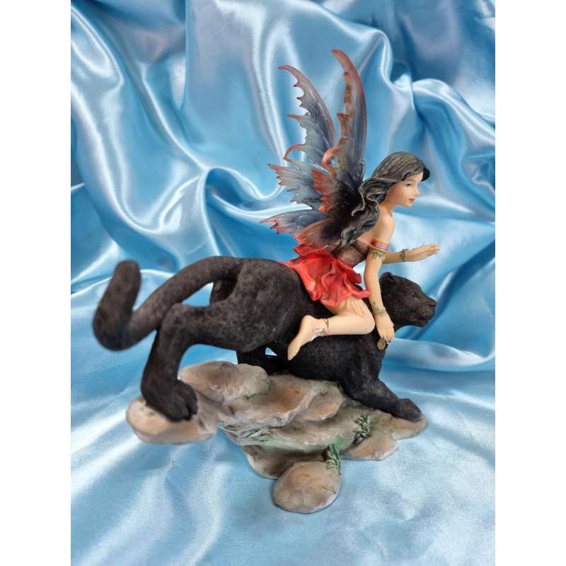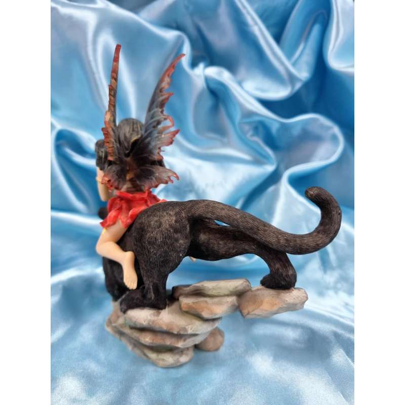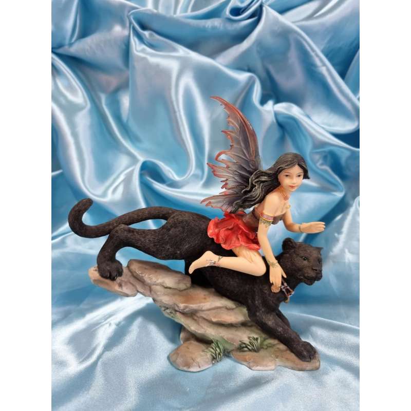 Salvaje y temeraria, este hada monta con orgullo esta hermosa pantera negra. Estatuilla de hadas "Springruse" de la Colección Faerie Glen, viene en una caja de cartón decorada con motivos florales y rellena de poliestireno con la forma adaptada especial para el transporte.