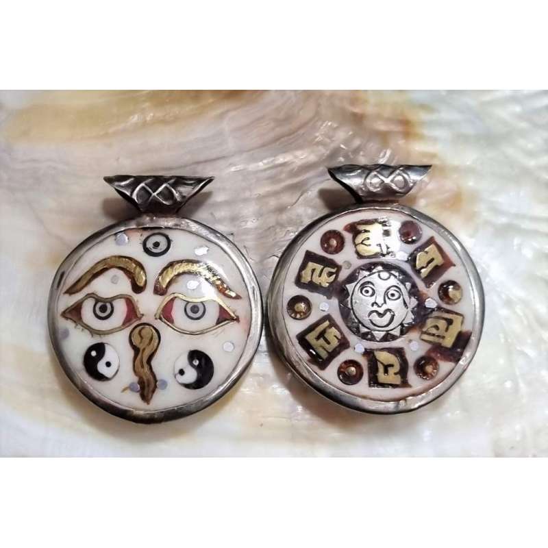 Original colgante circular de hueso de yak y plata Tibetana, en una cara del colgante está la representación de los ojos de Buda, en la otra cara figura las seis silabas del Mantra Om Mani Padme Hum. El enganche del colgante es el nudo de la suerte, uno de los ocho símbolos auspiciosos del Tibet o Astamangatas. Cuenta con dos figuras del ying y el yang